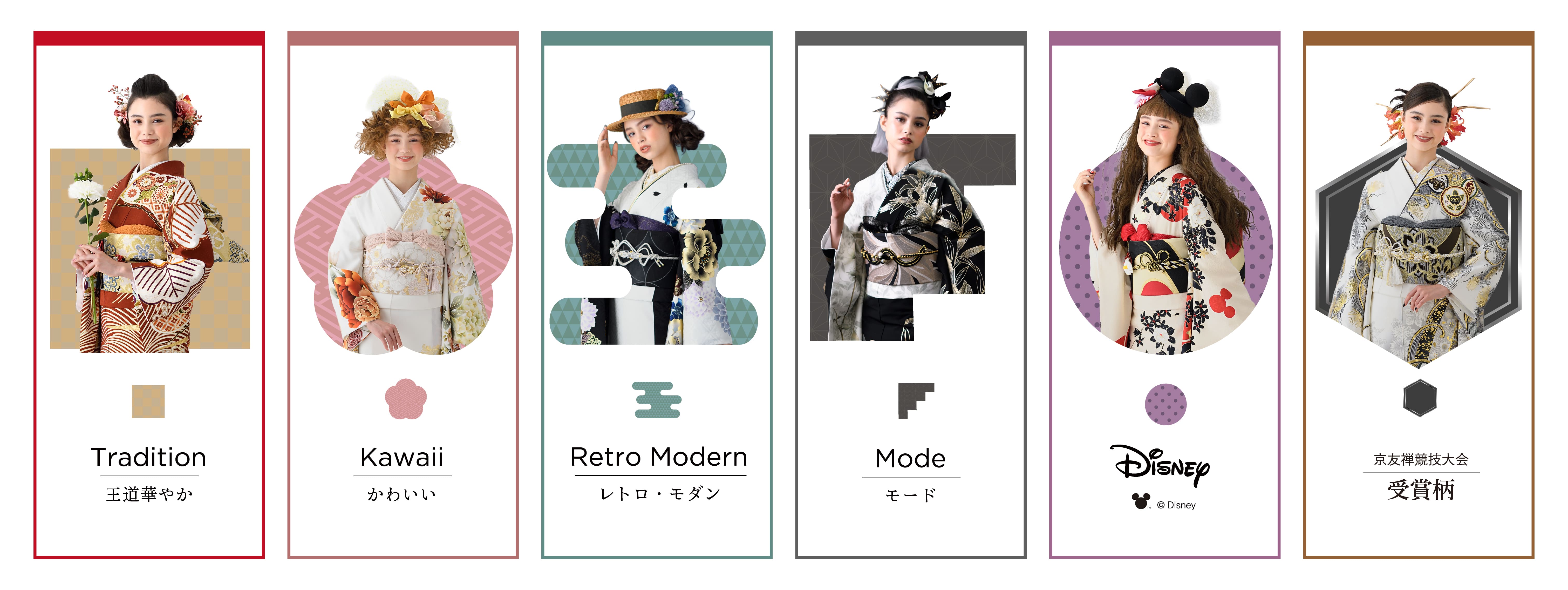 振袖には多彩なデザインのものがラインアップしています。伝統的なモチーフや技術を使った古典スタイル、ポップな色使いでキュートな印象のかわいい系、伝統的なモチーフと現代的なセンスが融合したレトロモダン、クールでスタイリッシュなモード系など、振袖によって醸し出す雰囲気は異なります。