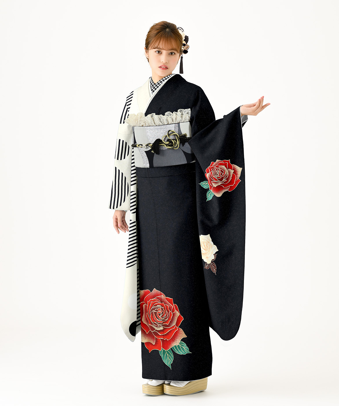 「ふりホ」では、ブラックをベースに鮮やかなレッドが映える振袖(AF-C006)がおすすめ。
