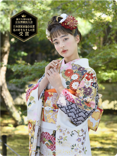 京友禅競技大会格式ある京友禅競技大会で、名誉ある賞に選ばれた新作振袖が今年も登場。受け継がれた伝統の技に今の感性を加えたデザインは、思わず見惚れる美しさ。匠の手仕事とセンスが専門家に認められた特別な1着が、あなたの人生の節目を優雅に彩ります。