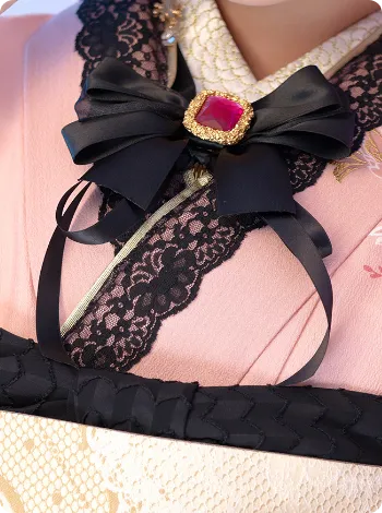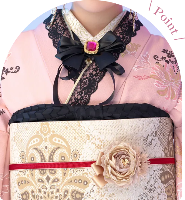 重衿や帯揚げにも黒レースをあしらい、