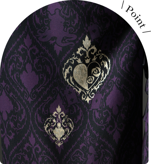 ディズニーヴィランズ達を象徴するアートを文様に見立て統一感がでるよう同色で着姿になったときシンプル且つポイントになるよう配置しました。