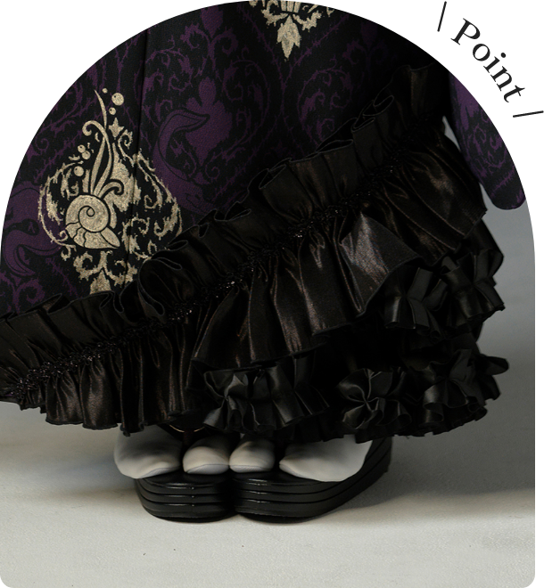 フリルや重なりのディテールが、動きに合わせて表情を変える裾元。