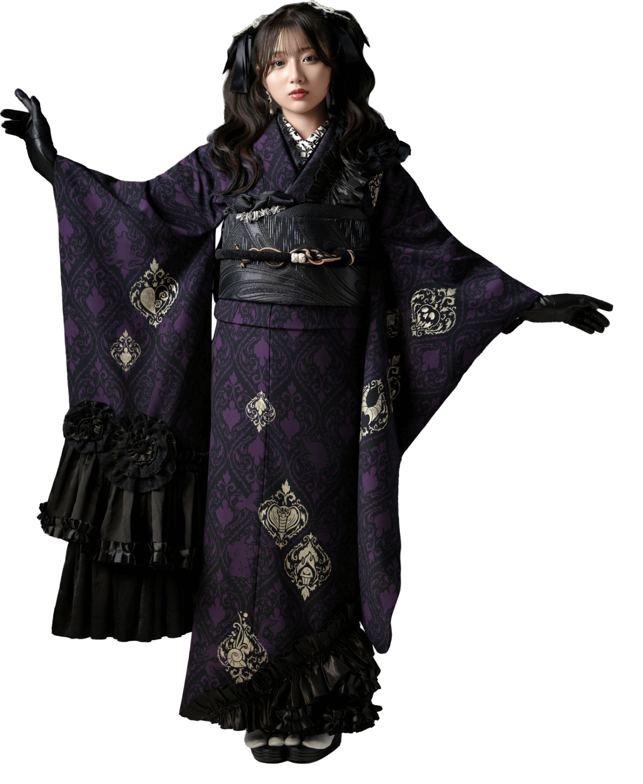 - A.ディズニーのヴィランズたちをインスパイアした振袖で黒色は普段の私服でも選ばないので挑戦でした。新しい自分を見つけた感じがします。バラが肩のほうにあるのと、片方にだけフリルやレースがついているのが本当にかわいすぎて。