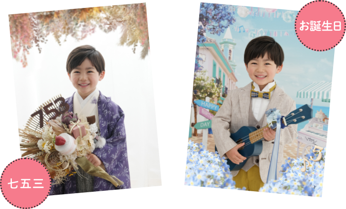 - バースデー撮影と七五三撮影を一緒に楽しめるから、ハッピーも2倍!お誕生日だけのスペシャルな撮影や限定セットをご用意しています。