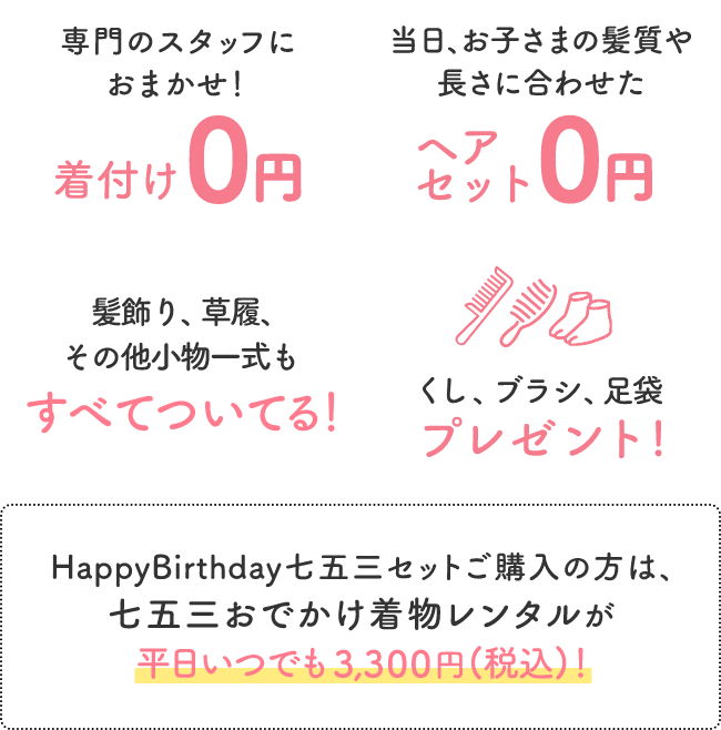 上記以外にもおでかけ用着物レンタルをおトクにご利用いただける七五三1Dayプランをご用意しています。詳しくは店舗スタッフまでお問い合わせください。 - ※平日は、土・日・祝日を除く日とさせていただきます。