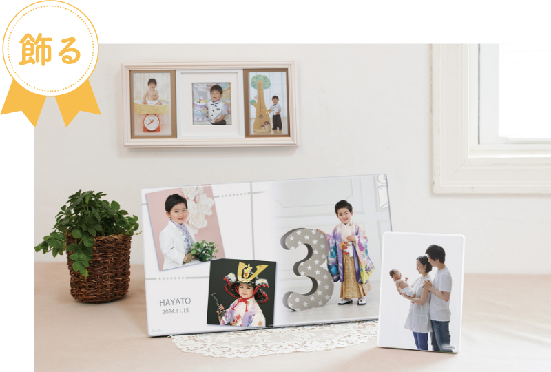 撮影した写真はしまい込まず、お部屋に飾ったり、時にはアルバムを見返したりしましょう。そして、写真を見ながらお子さまをほめてあげてください。自分が写っている写真に囲まれて育ち、ほめられることで、お子さまの自信をはぐくみます。