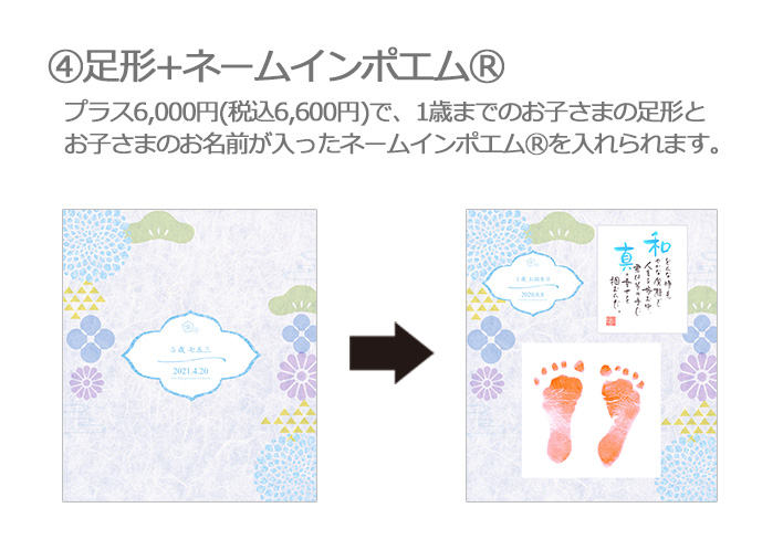 アルバム用増えデジプリントのタイトルページに、「足形」「ネームインポエム」「エコー写真」を追加することが出来ます。