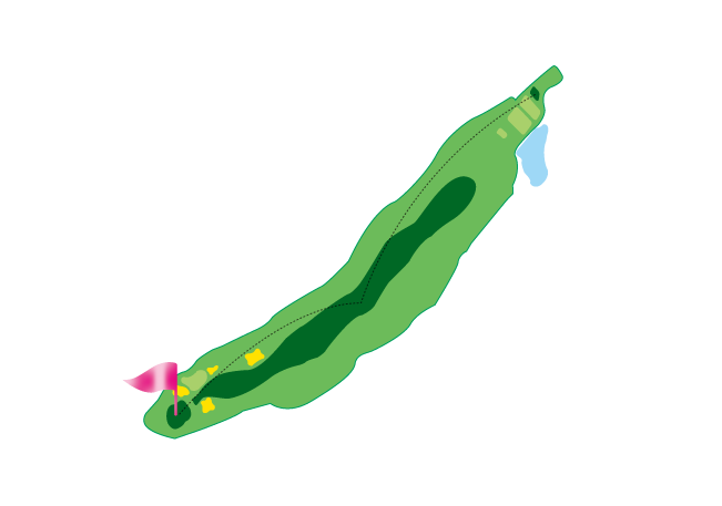 フェアウェイ両サイドのバンカーに注意しながら、思い切って勝負を賭けたい打ち下ろしのパー4。左側の池にも要注意!