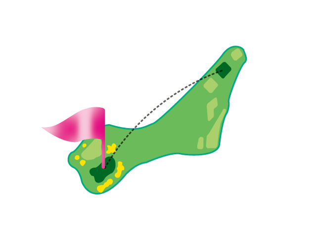 打ち上げで距離の短いパー4。右の池と左のバンカーに注意しながら、確実に2オンを狙っていこう!