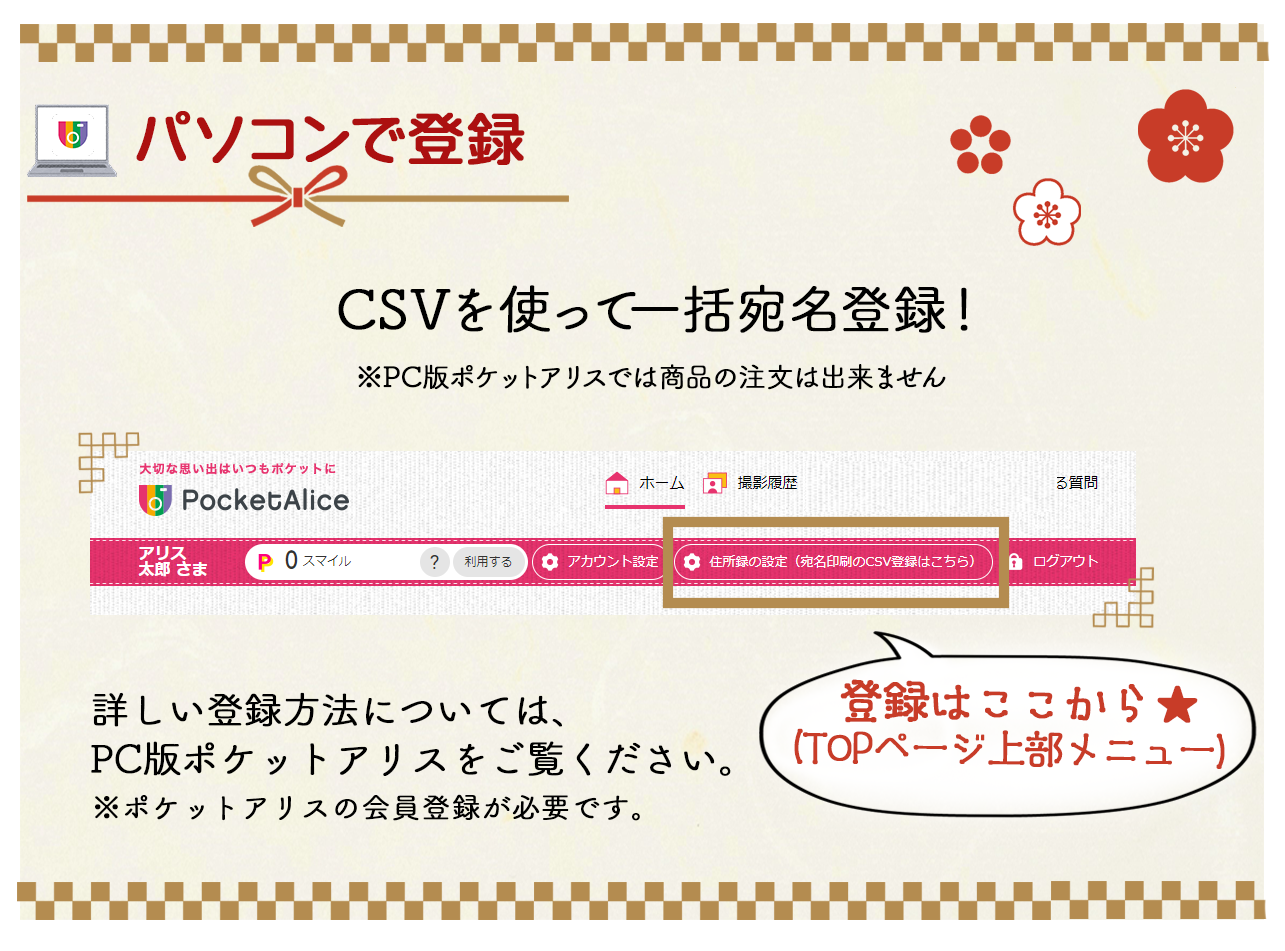 ポケットアリスの宛名印刷について|キャンペーン情報|マタニティ、赤ちゃん、こどもの記念写真撮影ならこども写真館スタジオアリス|写真スタジオ・フォトスタジオ