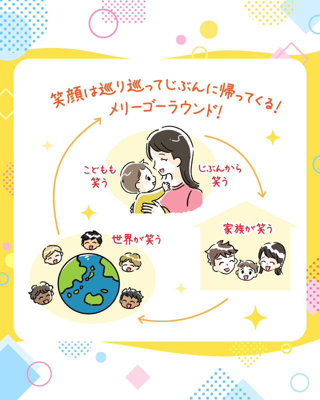 水谷さんが大切にしている言葉に「和顔愛語(わがんあいご)」があります。これはブッダによる約2500年前のメッセージです。その意味は「何もなければ笑顔と優しい言葉を相手に与えてください。必ず笑顔と優しい言葉があなたにかえってきます」というもの。自分が笑えば、相手も笑ってくれる。これはMERRY PROJECTが発信してきたように初対面の人同士でも、友人や家族、親子でも一緒です。「楽しいこと、幸せなときは、笑顔を通じて巡り巡って自分にかえってきます。メリーゴーラウンドです」と水谷さんは笑います。確かに世の中にも、子育てにも困難は絶えず、笑えばすべてが解決するわけではないかもしれません。それでも、まず自分が笑う。最初は無理にでも笑う。すると、身近なところから変化が生まれます。こどもが変わり、家族が変わり、世界が変わっていきます。「笑うためには、完璧を求めすぎず、小さなできごとを一緒に楽しむことです」と水谷さんは笑顔の秘訣を語ります。「今日のご飯おいしいね」「一緒に食べられてうれしいね」といった日常会話や時間の共有が自然に笑顔を生み出します。家族や仲間と「ありがとう」を伝えあうことも大きな力になります。さらに「笑顔には、たくさんの健康効果が期待できます。」と水谷さんは語ります。笑顔でいることで、心身が整い、体全体の健康をサポートしてくれるのだそうです。子育てに笑顔を積極的に取り入れることで、家族の健やかな毎日につながるはずです。MERRY PROJECTでも提唱されているように、こどもたちの笑顔は、人を前向きにします。こどもたちの笑顔が、もっと広がれば、世の中はもっとよくなっていきます。今から、ここから、自分から、まず笑顔になってみる。それがこどもや家族を笑顔にし、すべての人が笑いあえる世界への一歩になるのです。スタジオアリスは「みんなで子育てPROJECT」を通じて、こどもたちの未来をこれからも応援していきます。