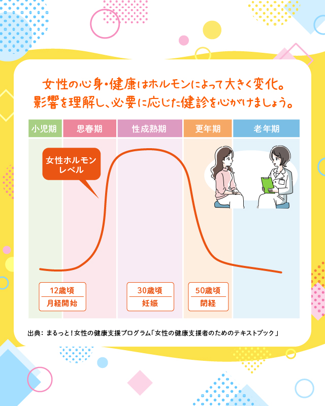 まず、女性はホルモンの状態に応じて、小児期、思春期、性成熟期、更年期、老年期と5つのライフステージに分けられます。女性ホルモンは、月経がはじまる思春期12歳頃から22歳頃までに増加し、妊娠がしやすい性成熟期を経て、閉経がある50歳前後の更年期に急激に低下するとされています。