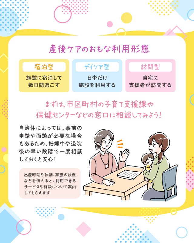 産後ケアには、いくつかの利用形態があります。たとえば、施設に宿泊して数日間過ごす「宿泊型」、日中だけ施設を利用する「デイケア型」、自宅に支援者が訪問する「訪問型」など。