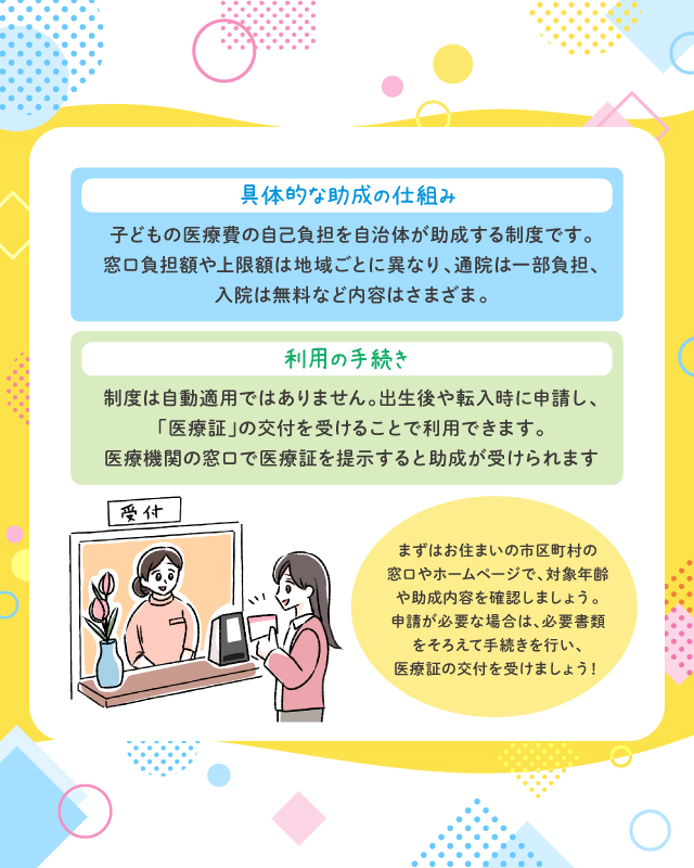 次に、利用のための手続きについてです。多くの場合、この制度は自動的に適用されるわけではなく、出生後や転入時に申請を行い、あらかじめ「医療証」の交付を受けることで利用できる仕組みになっています。医療機関の窓口で医療証を提示すると、その場で助成が反映される地域もあれば、いったん支払って後日払い戻しを受ける方式の地域もあります。