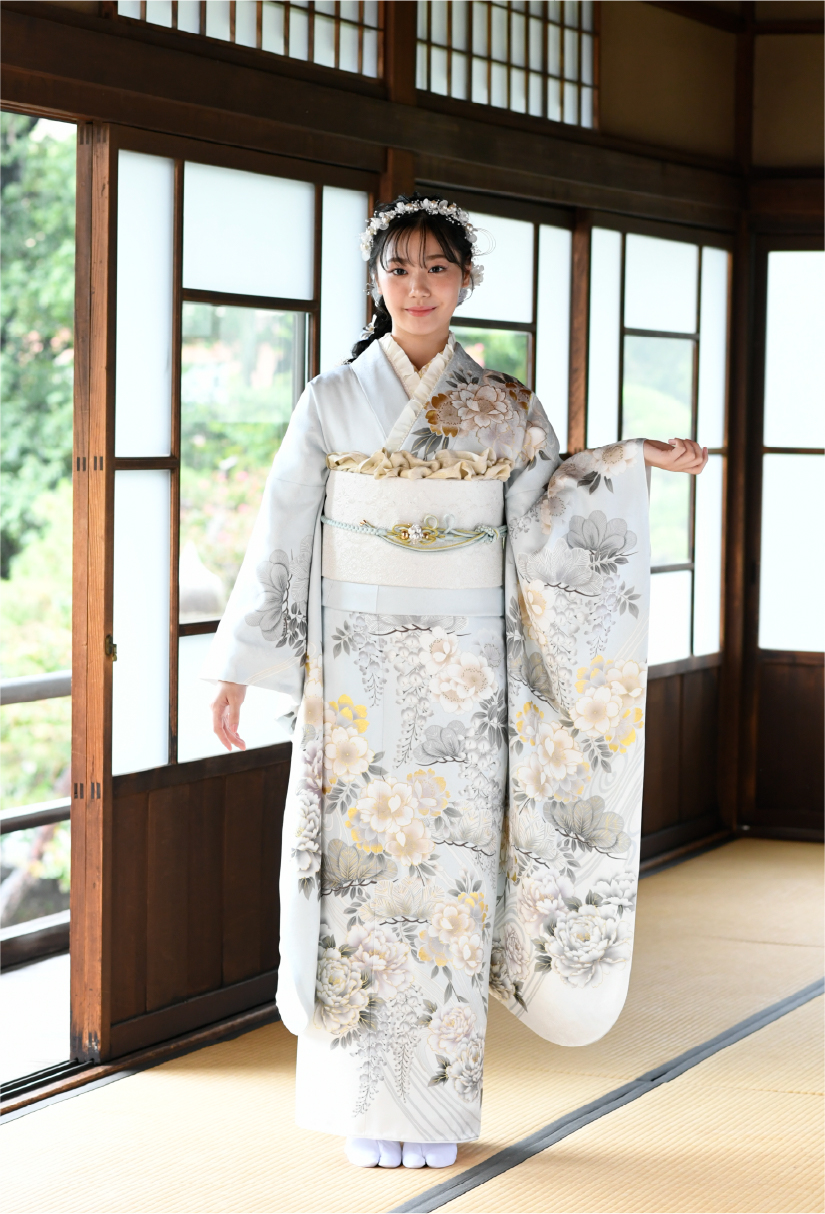 グレーと白の染め分けが美しい地に描かれた花々や白詰草がクールでシックな魅力あふれるスタイリッシュな振袖です。随所に施された金彩加工と横降り刺繍が煌めきを添えて。色味を合わせた小物使いで、より洗練された大人らしい装いに。