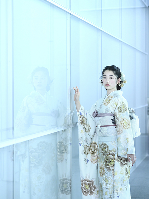 大きな洋花で構成された可愛らしいデザインの振袖。裾から身頃にかけて薄くぼかしを入れ、グラデーションに。花の描き方も地紋のように薄く描くものと水彩風と描き分けることで柄にボリュームをプラス。淡いグレーのコントラストが優しい雰囲気の1着。