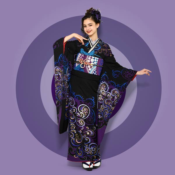 魔法の鏡の装飾を大胆に縁取り振袖全体で魔法の鏡を表現しました。