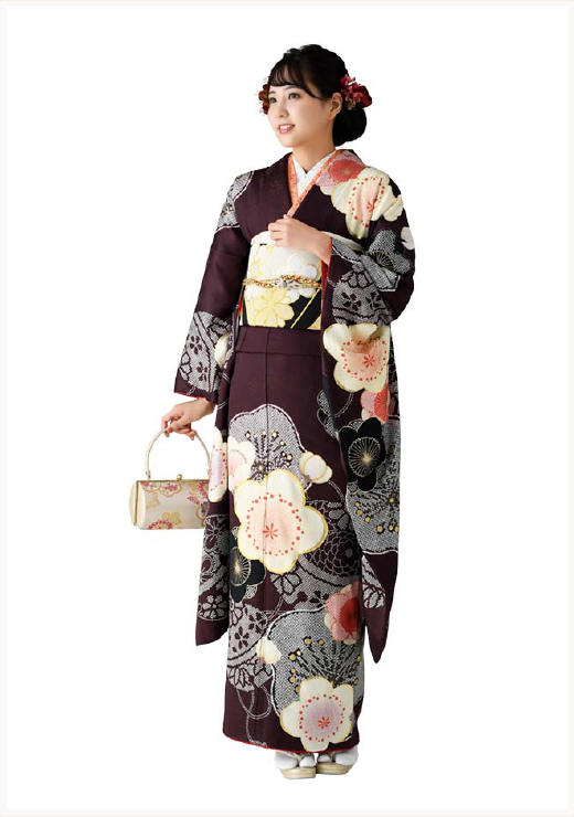 花をメインとした伝統的な柄が、ベースの紫に映える上品で華やかなコーディネートです。「B148」のように濃い紫は落ち着いた雰囲気に、「C020」のように明るい紫は華やかな雰囲気に仕上がります。