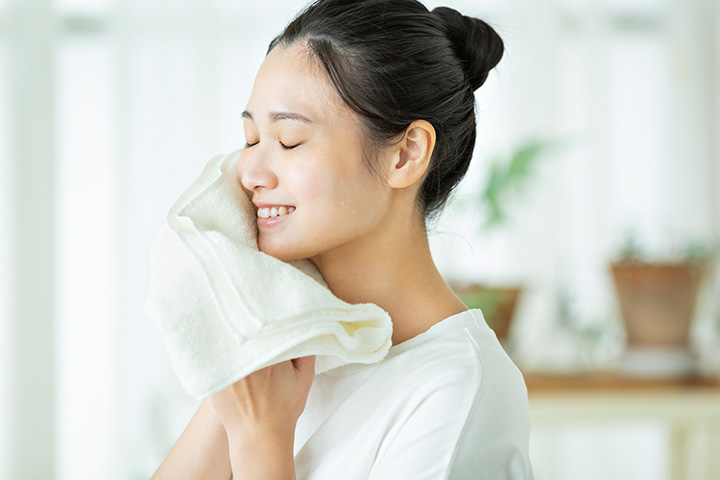 潤いを保つポイントは、化粧水をたっぷりと使い、水分が蒸発しないように乳液や美容液などでふたをすることです。つけるときに摩擦が起きないよう、優しく手のひらで押し込むように浸透させましょう。
