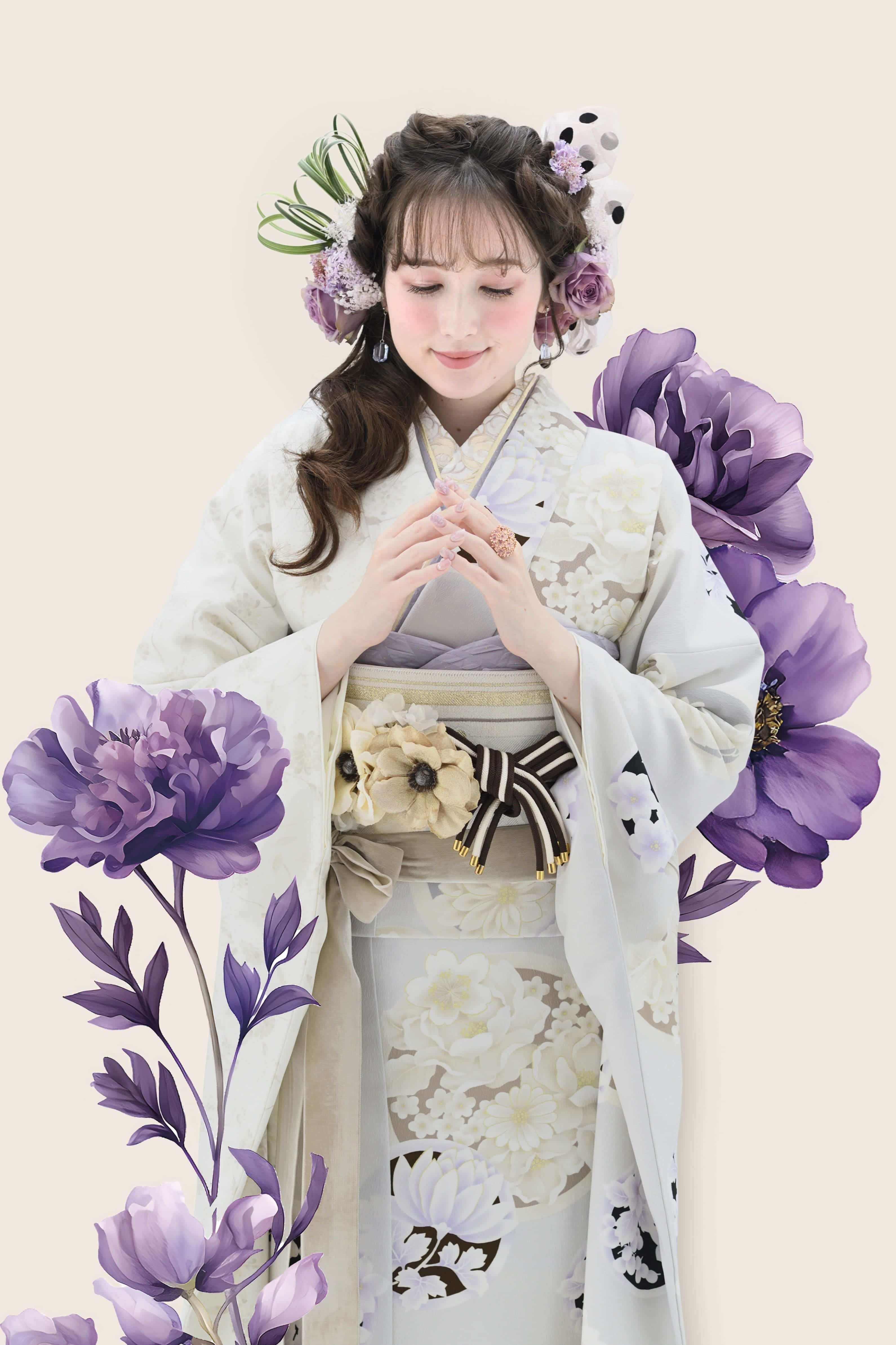 バイオレットのベースカラーが全身を包み込む振袖には、同系色で写実的に描かれた洋花が一斉に咲き誇っています。ボリューム感のあるデザインながら、静寂さえ感じさせる品の良さが最大の魅力です。