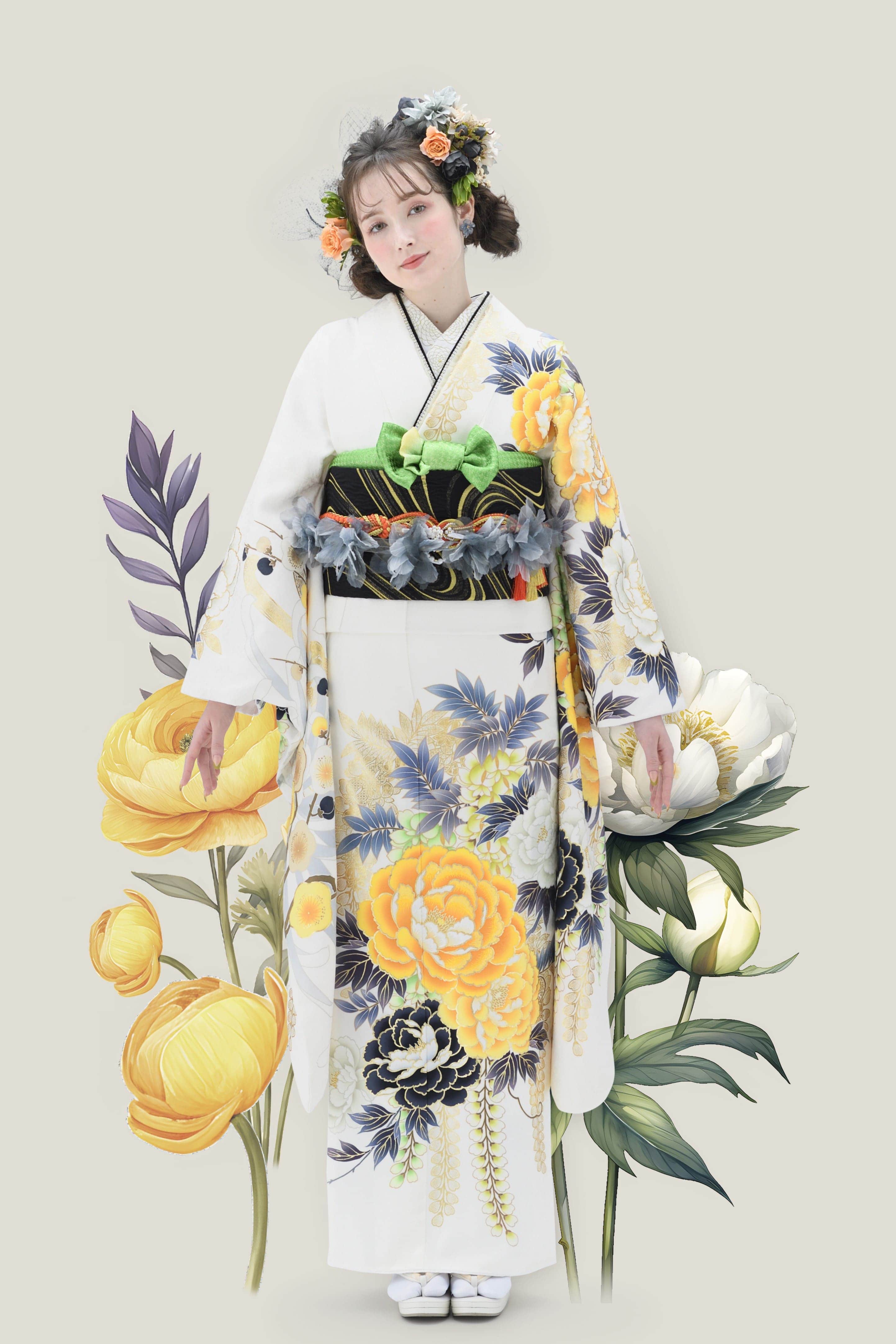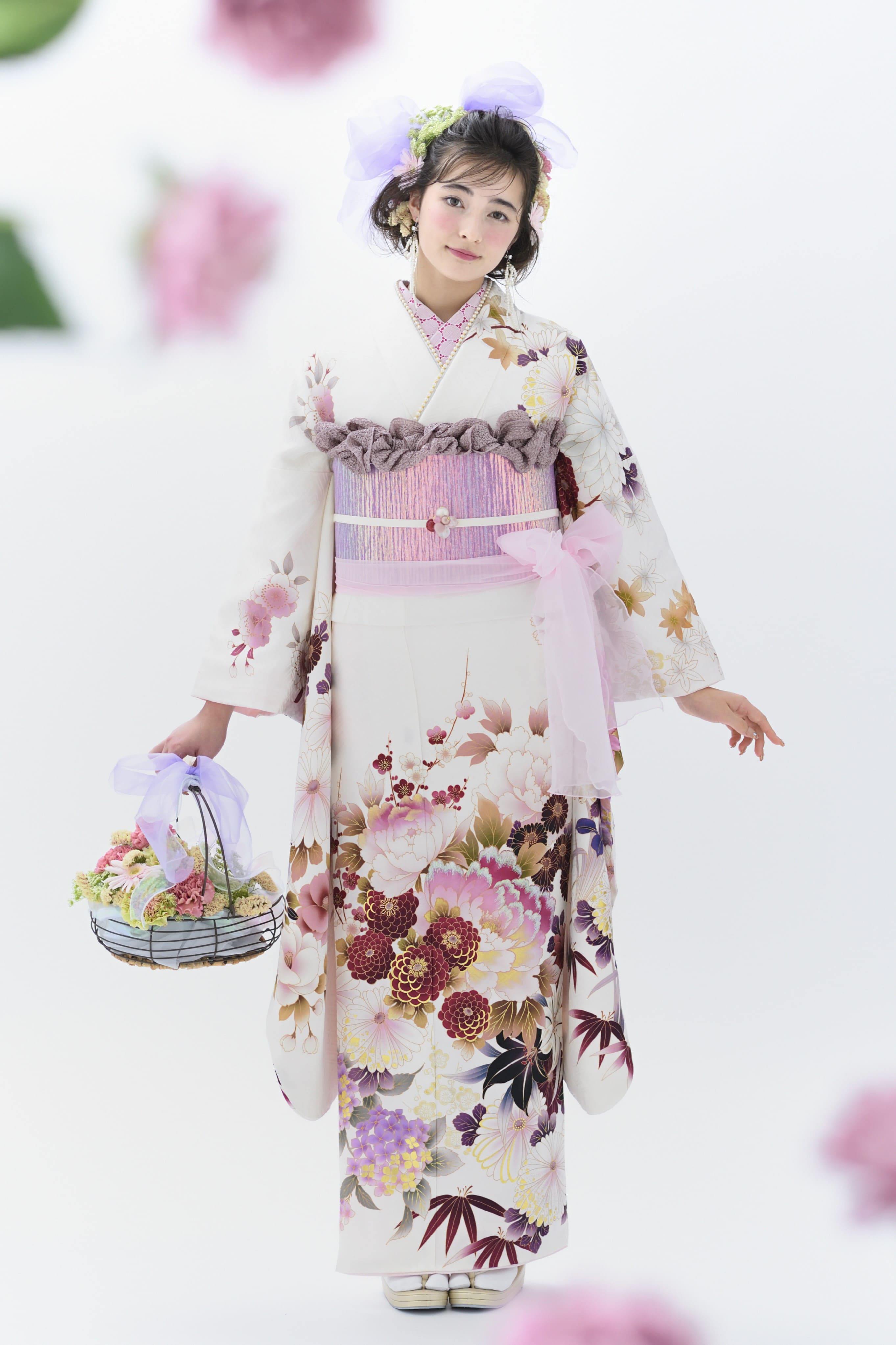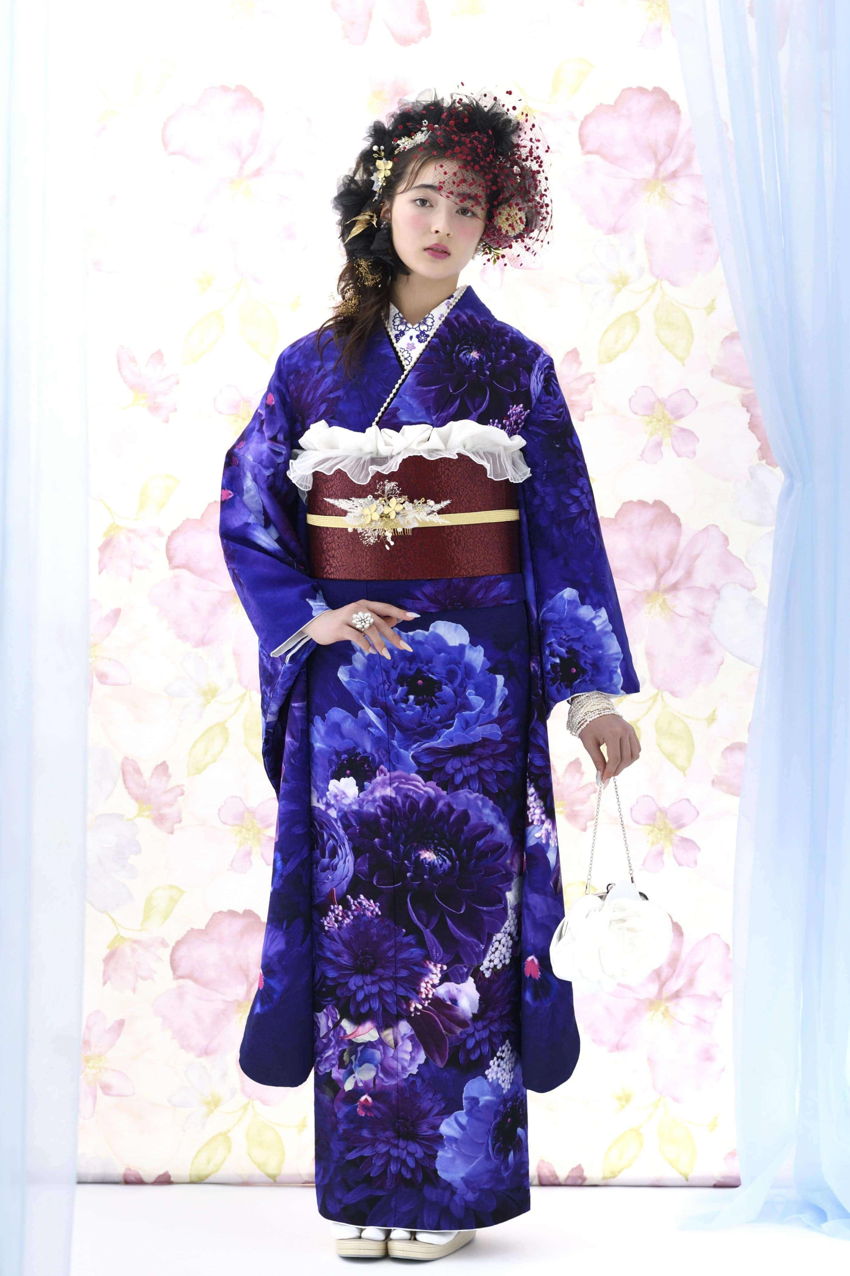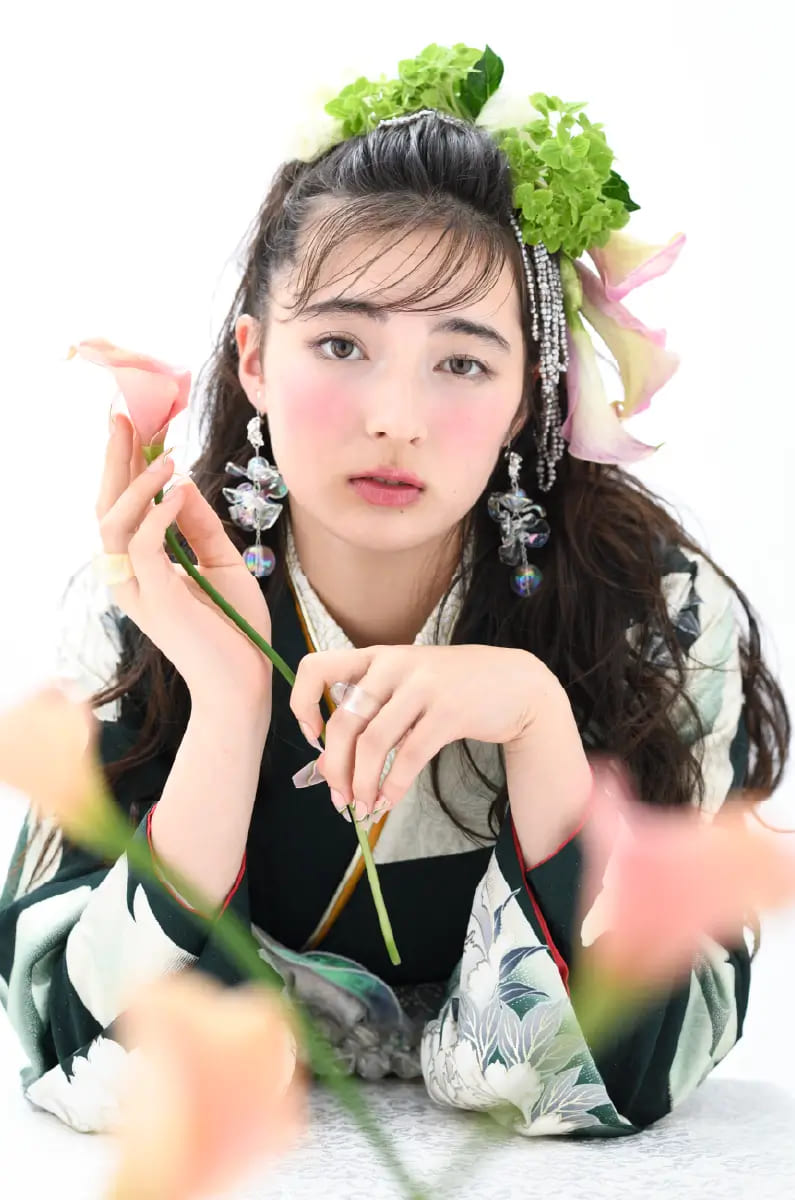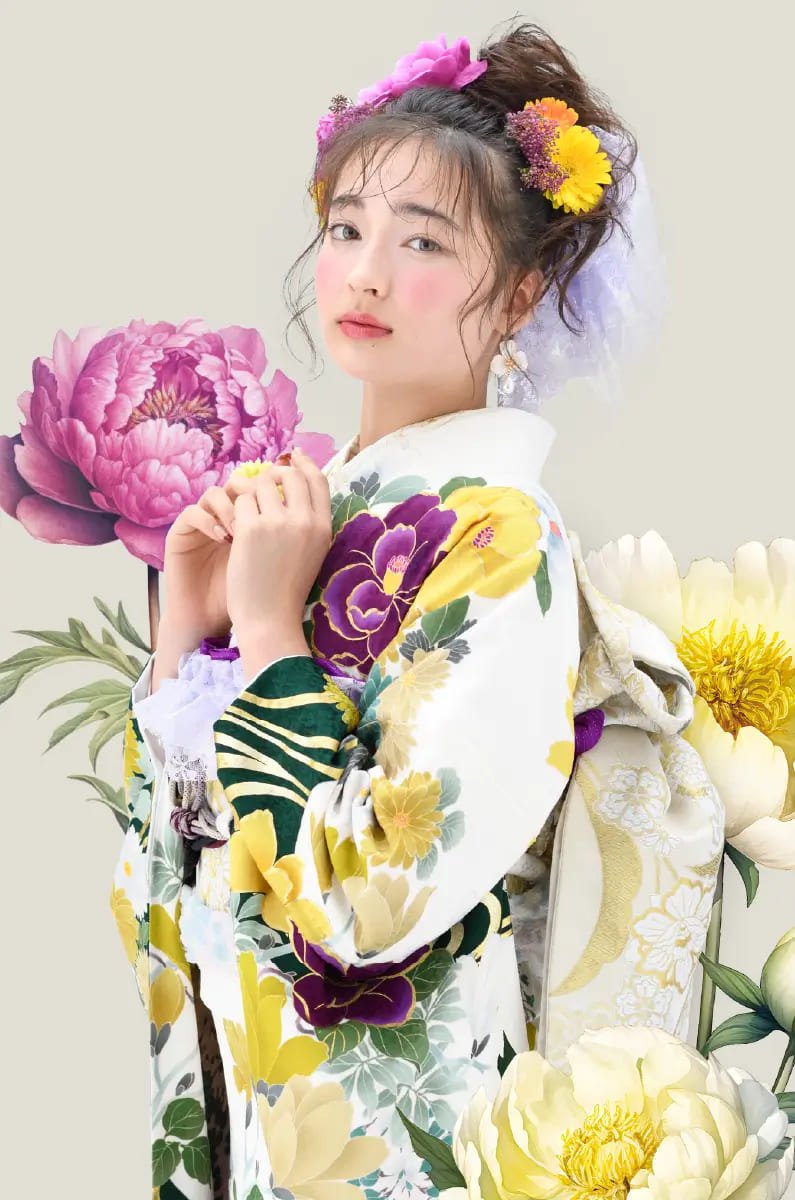 使われている色柄によって雰囲気は異なるものの、花々に包まれるような優しい空気感が大きな魅力。まるで妖精になったような軽やかさで、新成人の爽やかな旅立ちにぴったりの雰囲気に仕上げています。