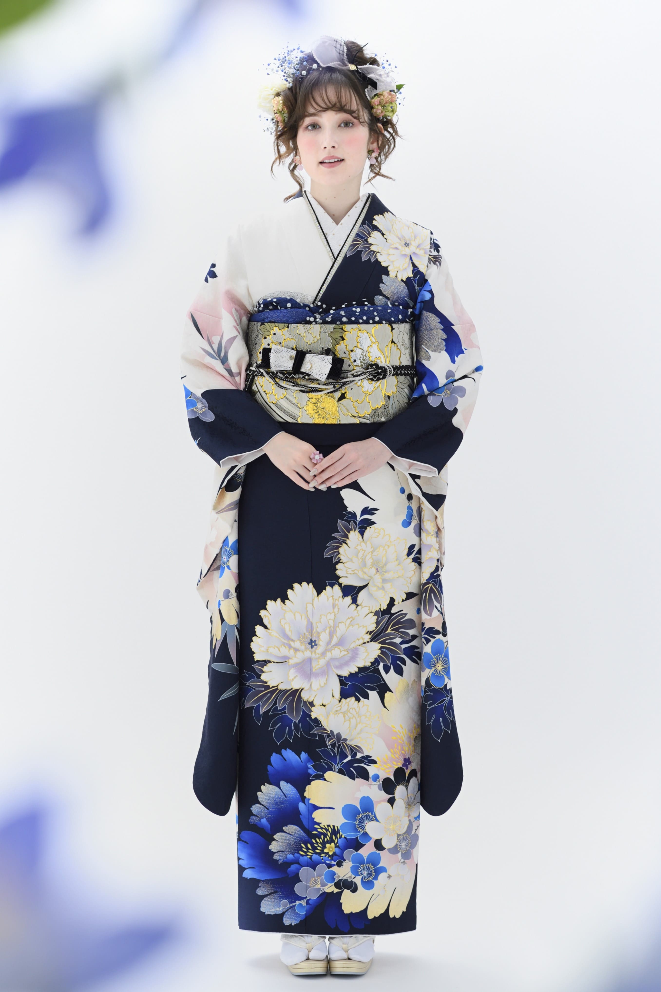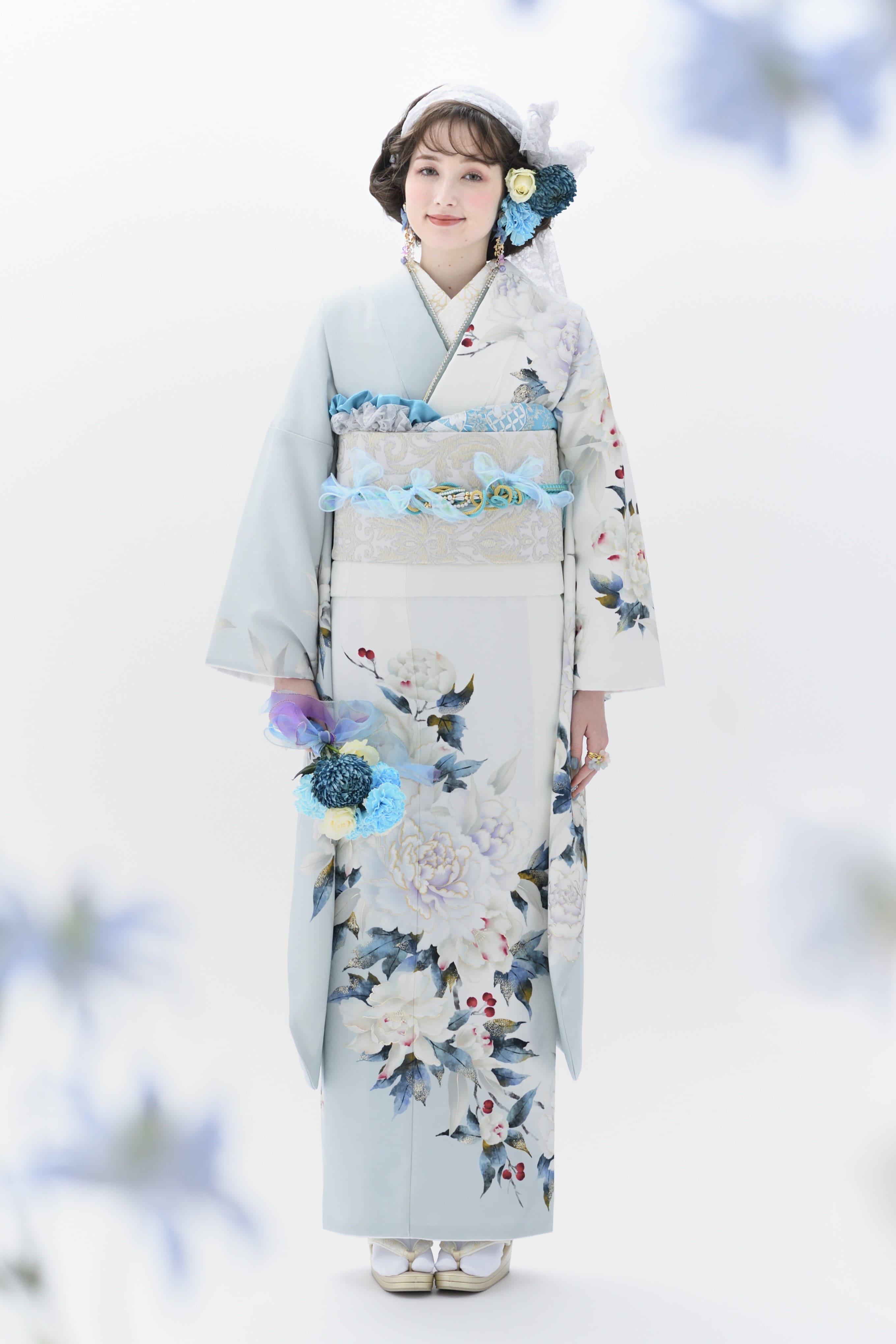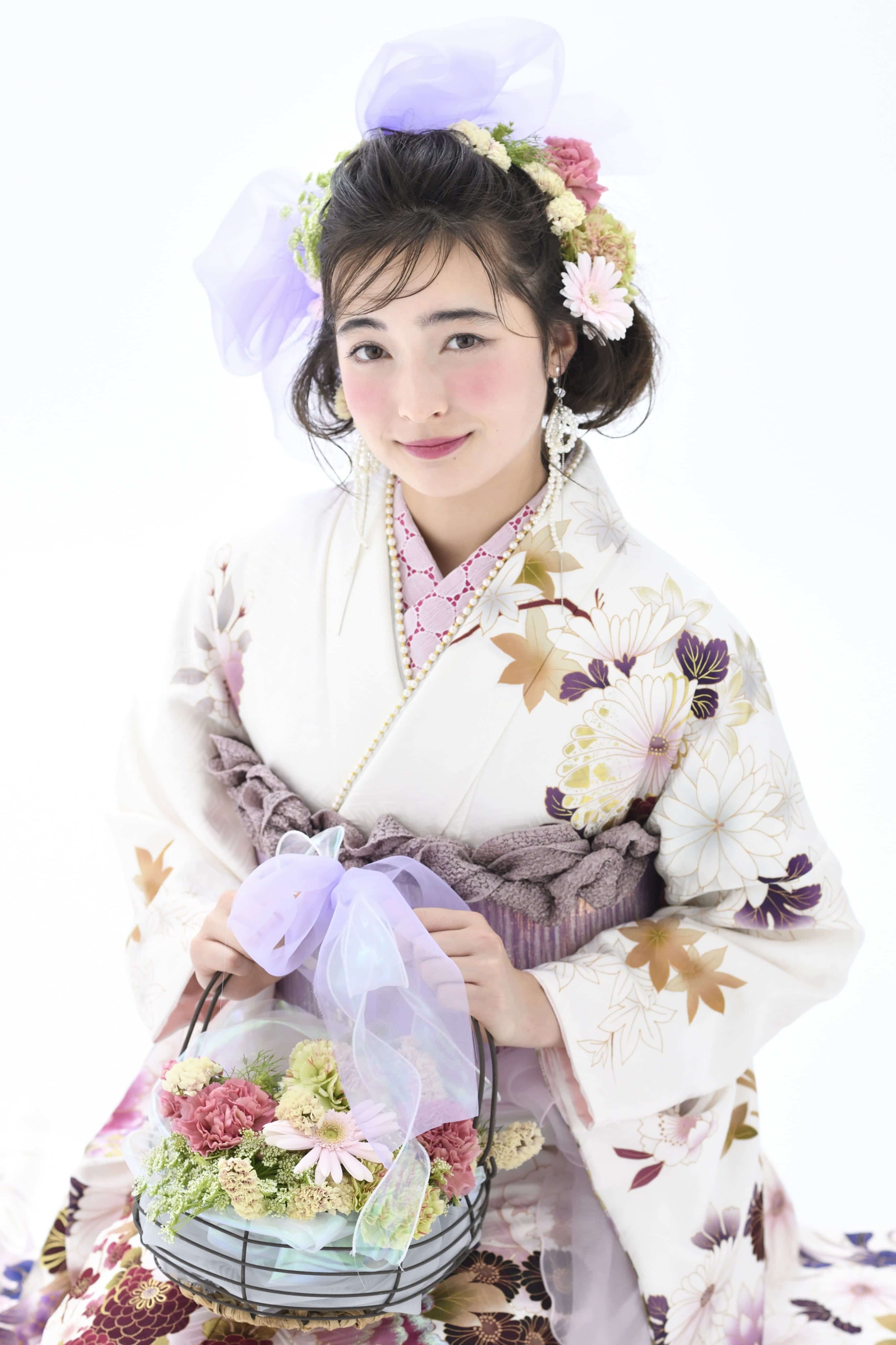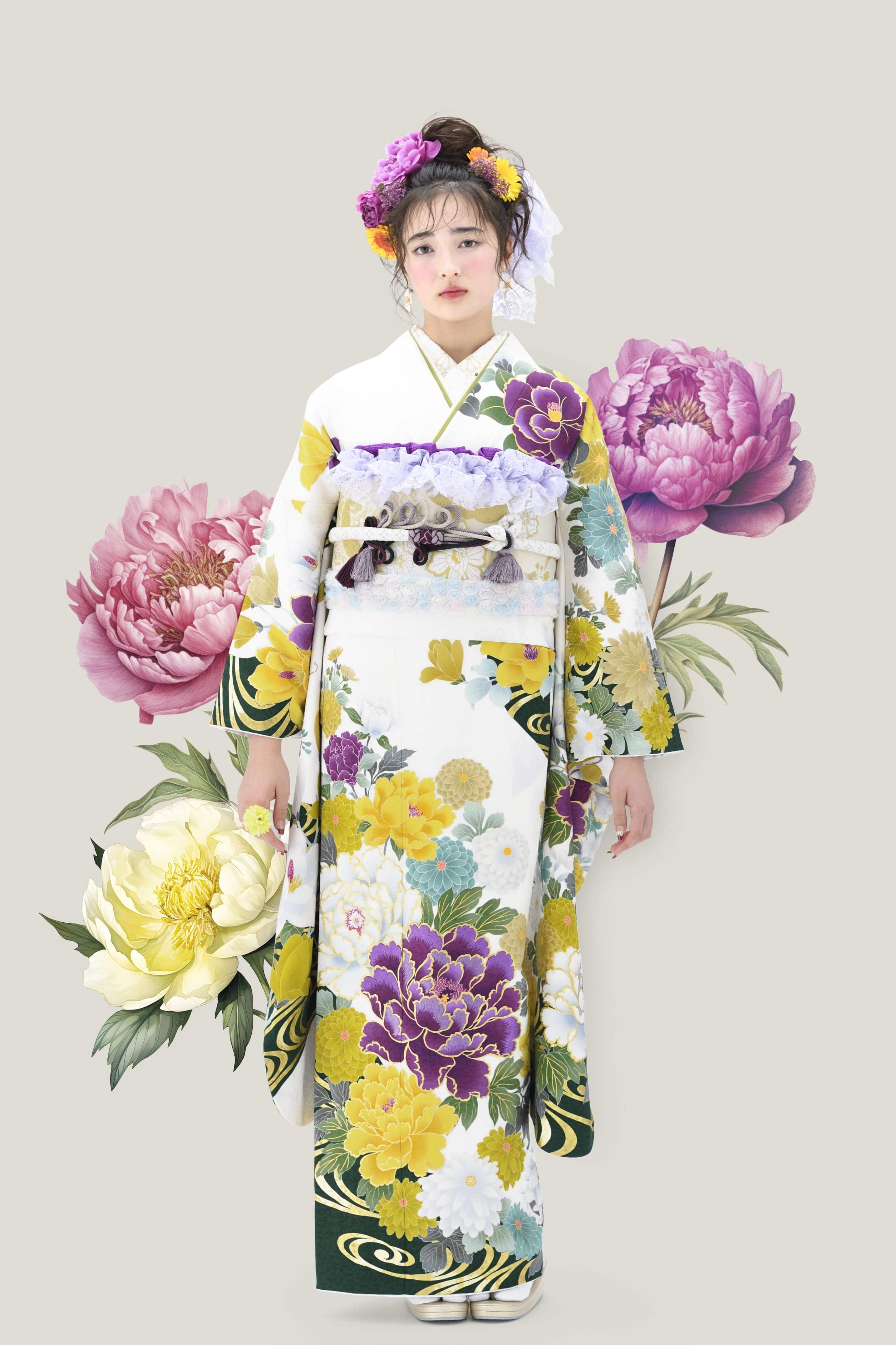 使われている色柄によって雰囲気は異なるものの、花々に包まれるような優しい空気感が大きな魅力。まるで妖精になったような軽やかさで、新成人の爽やかな旅立ちにぴったりの雰囲気に仕上げています。