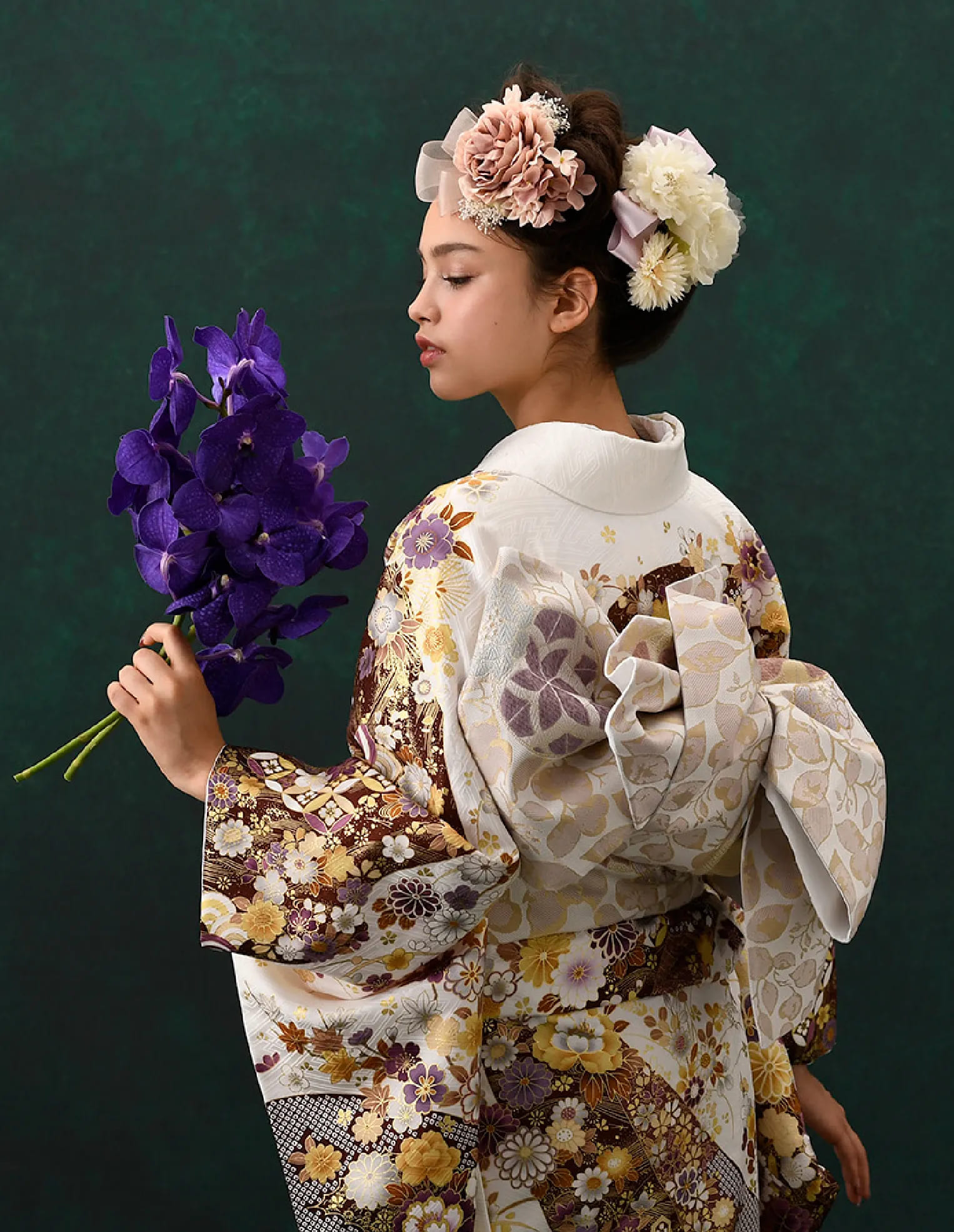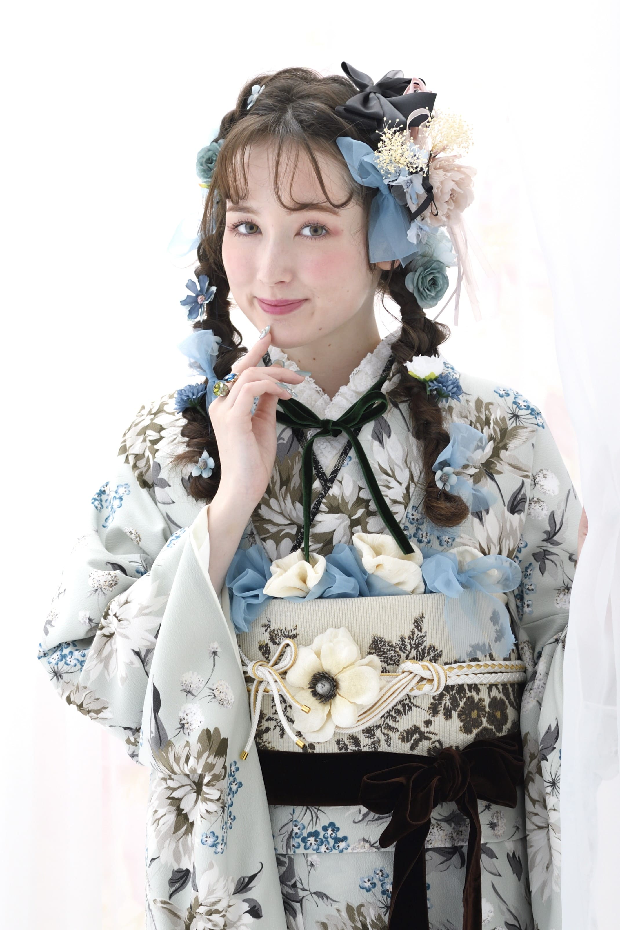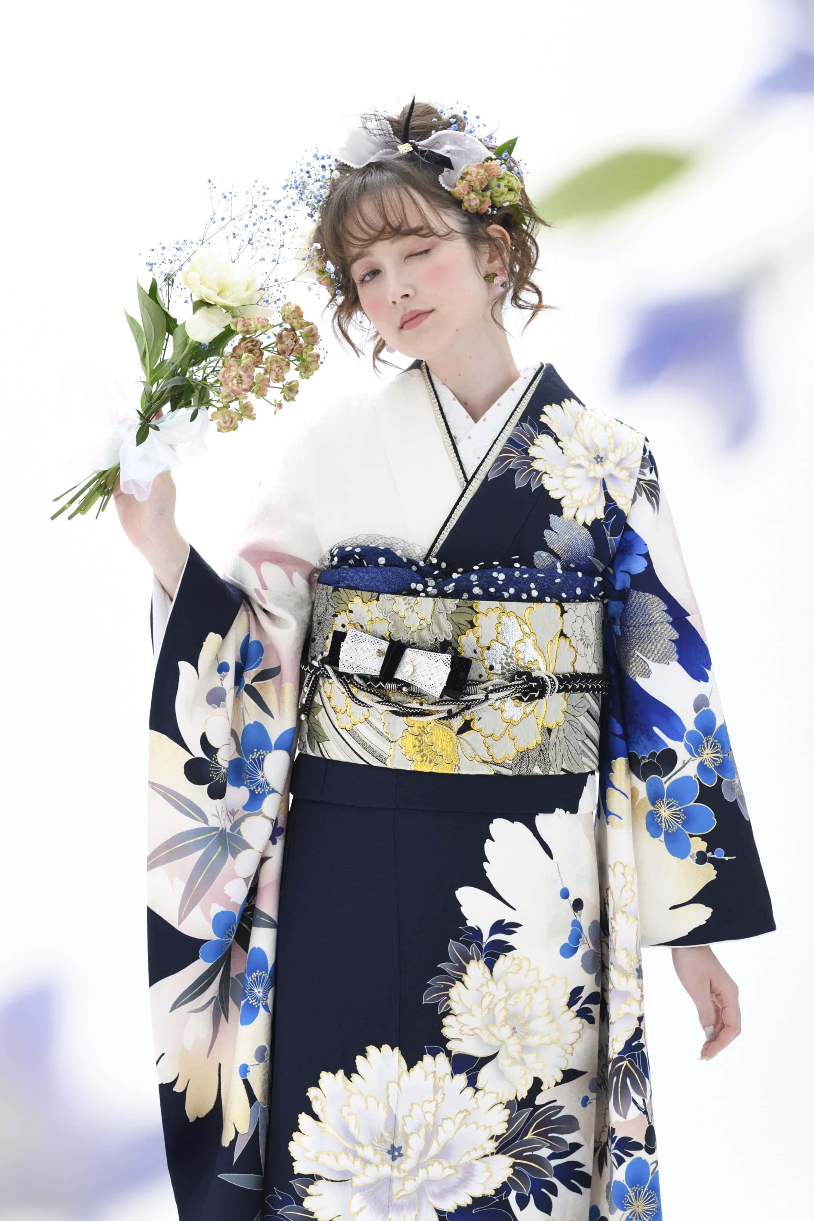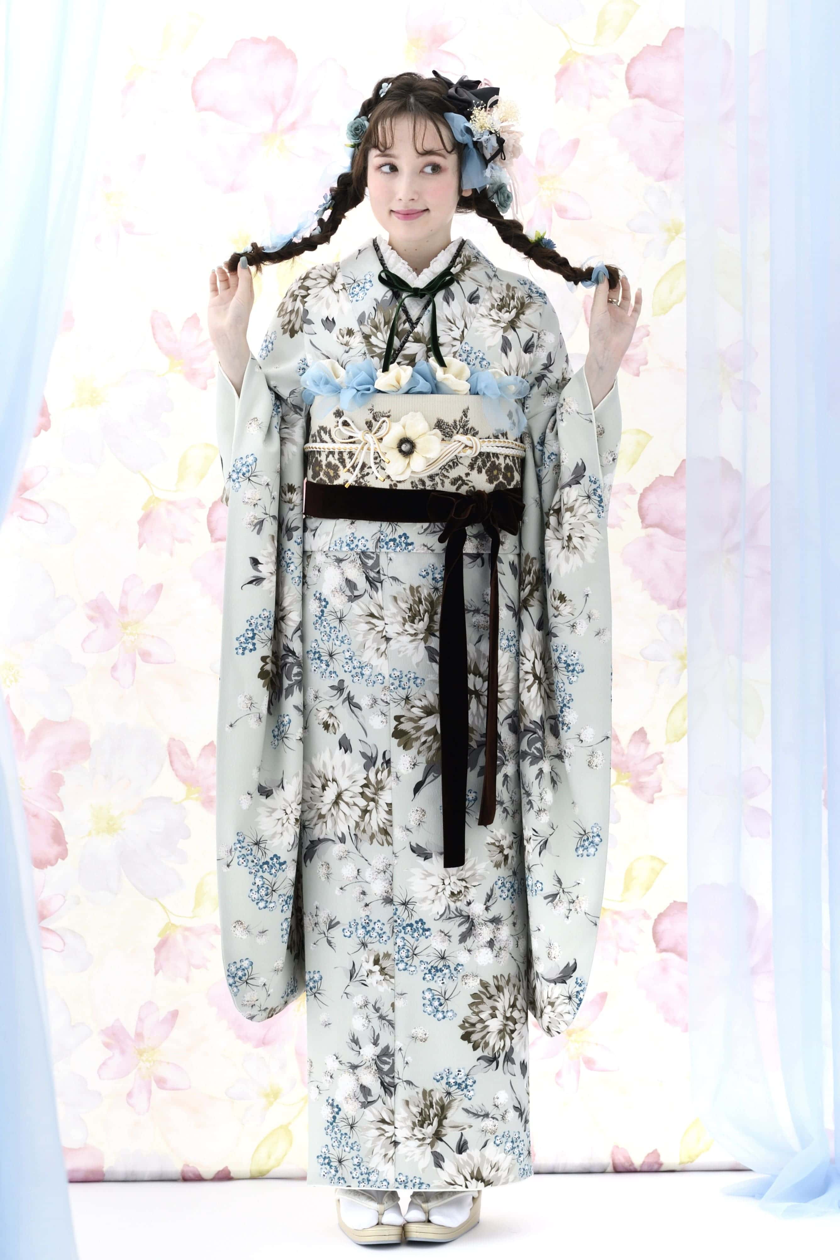 使われている色柄によって雰囲気は異なるものの、花々に包まれるような優しい空気感が大きな魅力。まるで妖精になったような軽やかさで、新成人の爽やかな旅立ちにぴったりの雰囲気に仕上げています。