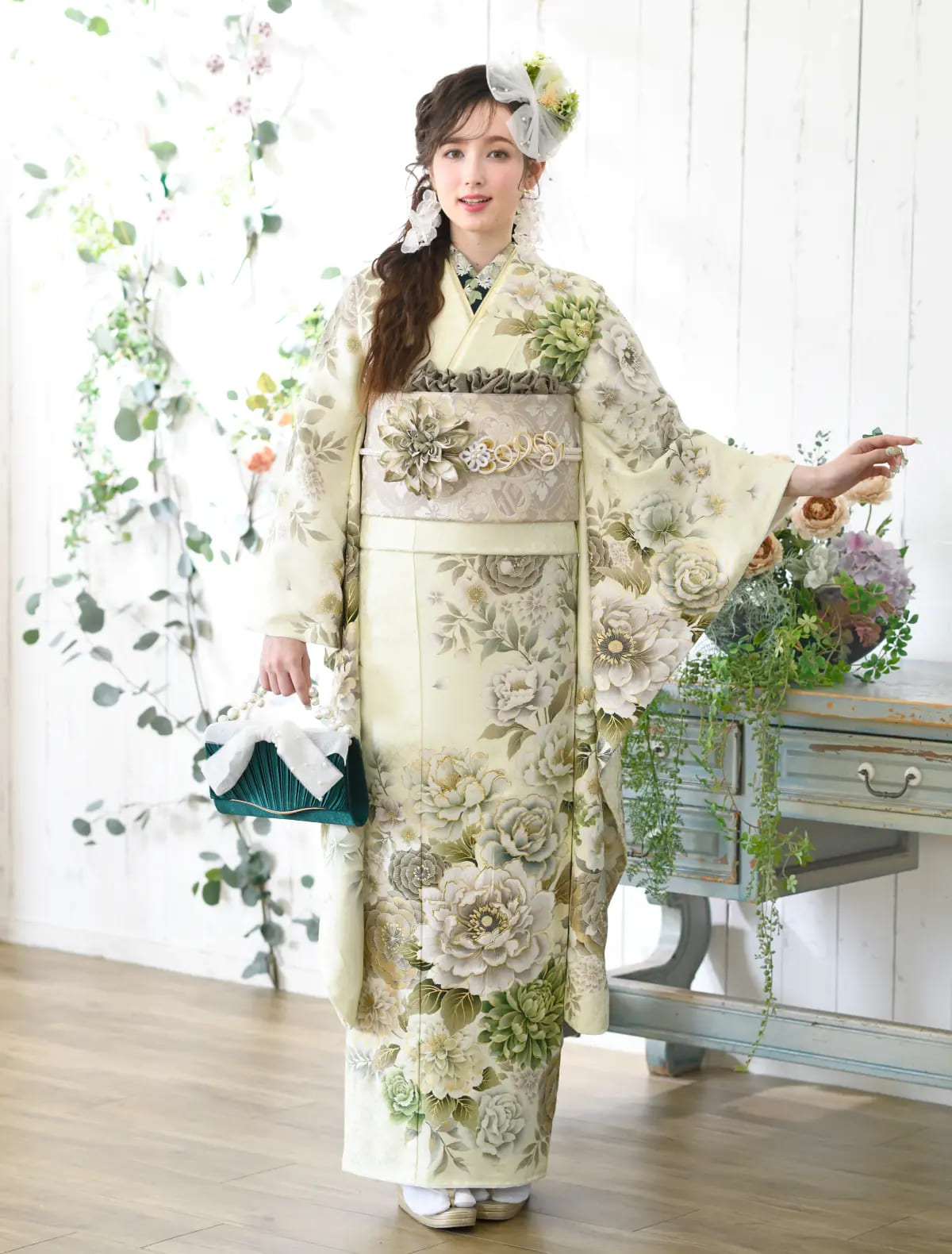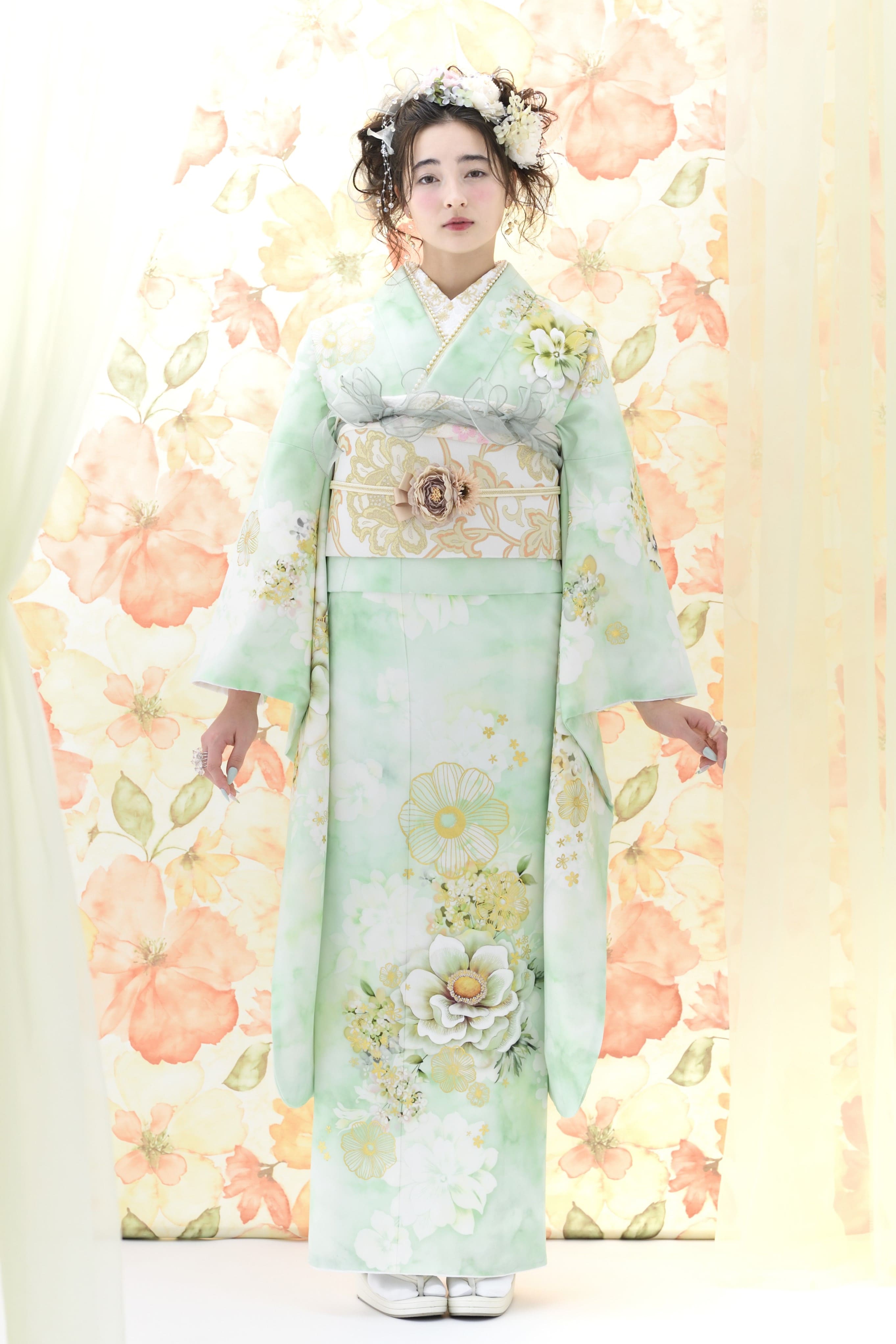 ライムグリーンのベースカラーに、ワントーンコーデでまとめられた上品な振袖姿。フラワーモチーフは描き方を変えることで奥行きを出し、花畑がどこまでも続いているような情景を演出しています。