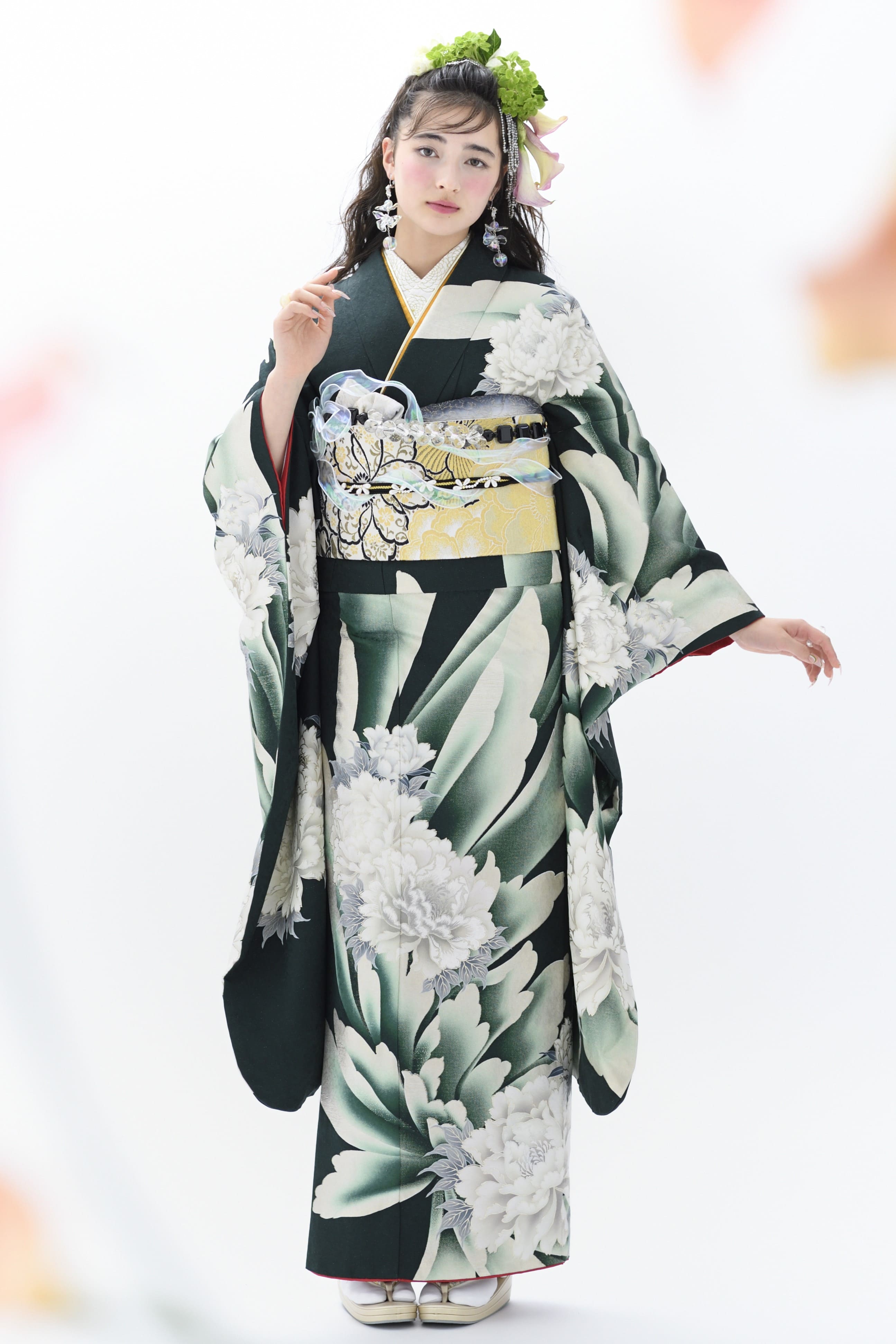 大人系ダークグリーン振袖でフラワーモチーフの本領発揮(AF-C050)