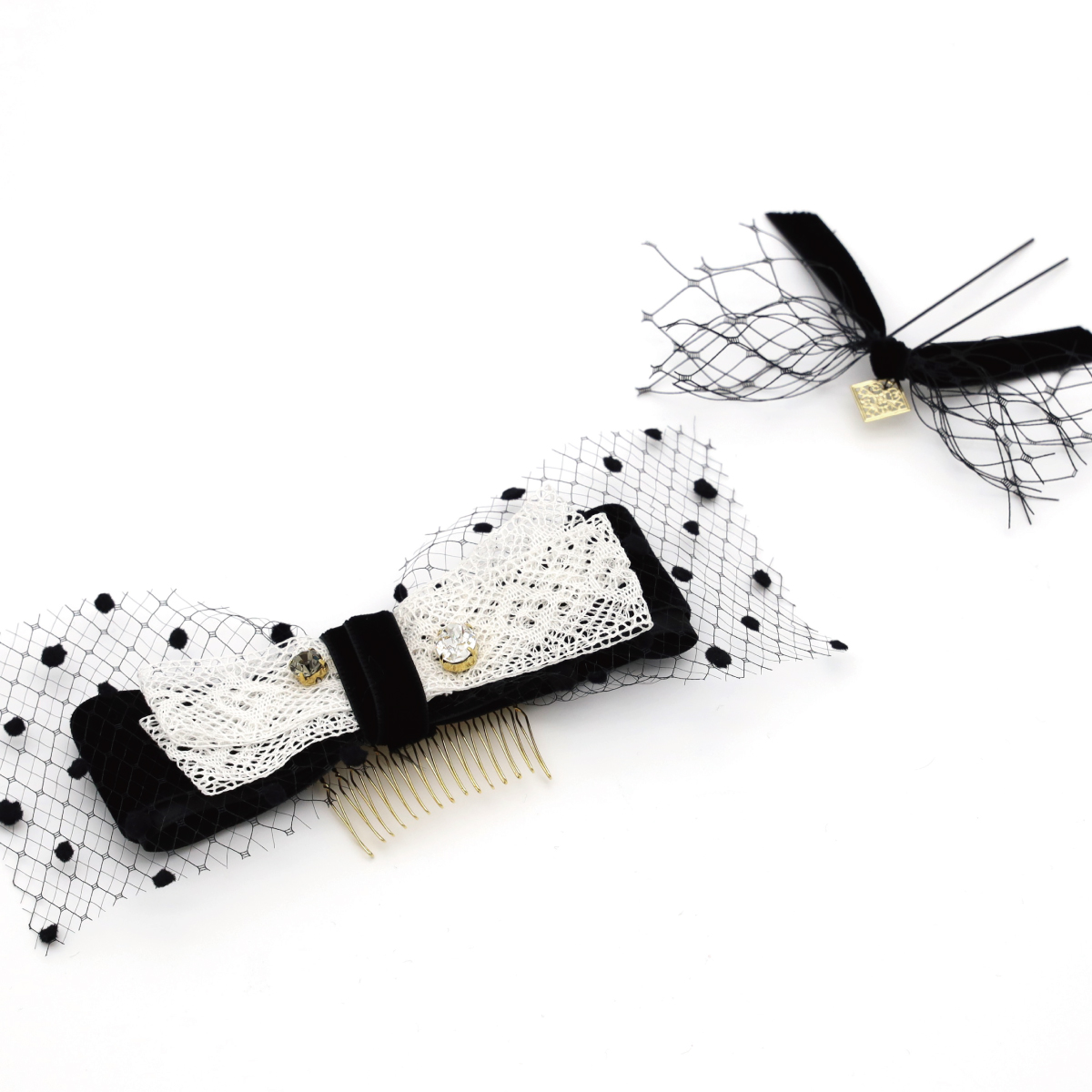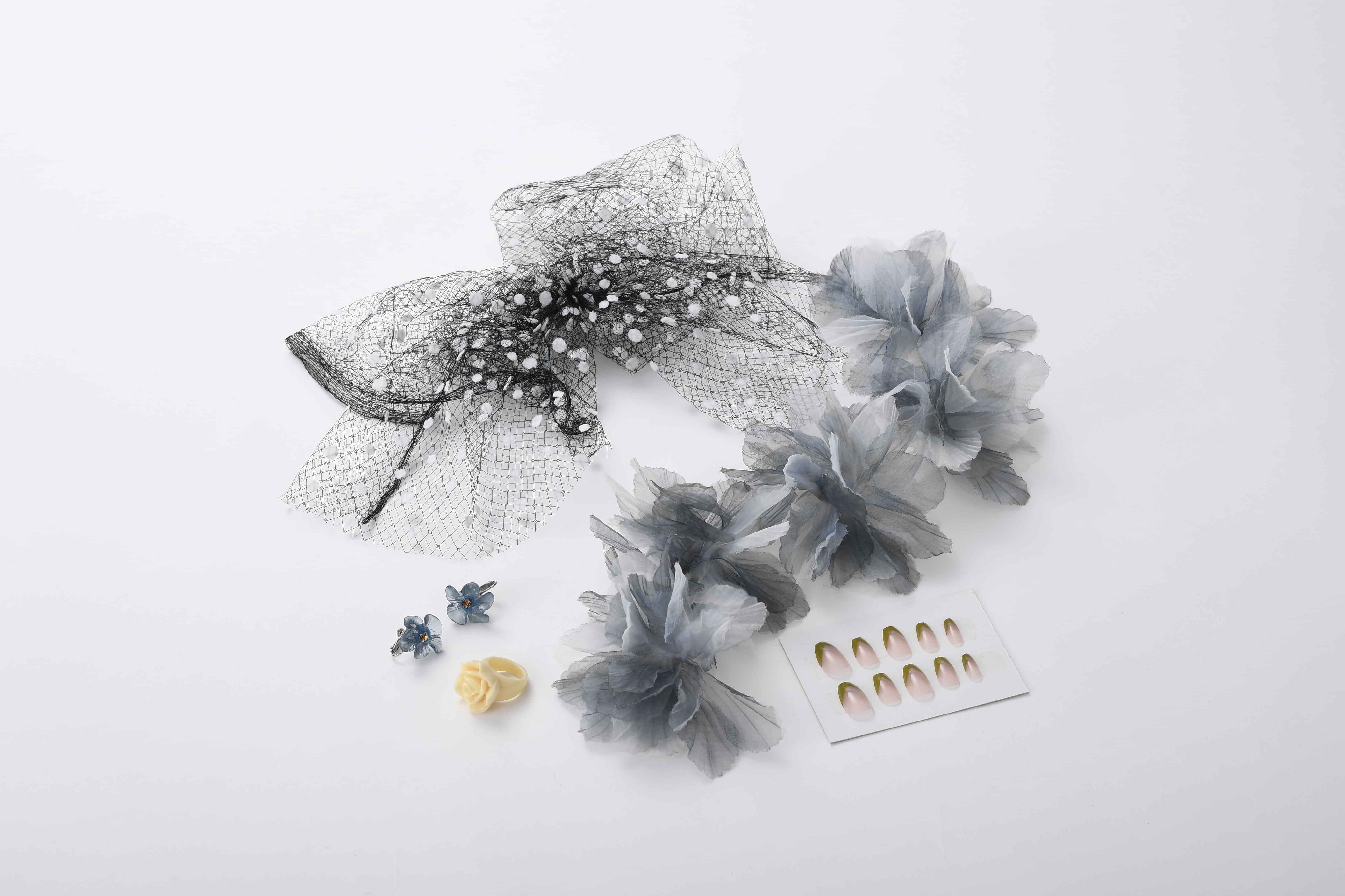 小物はモノトーンのチュールやオーガンジー素材、くすみカラーの髪飾りなどでシックにまとめている分、小さなオレンジの生花が鮮やかに映えます。