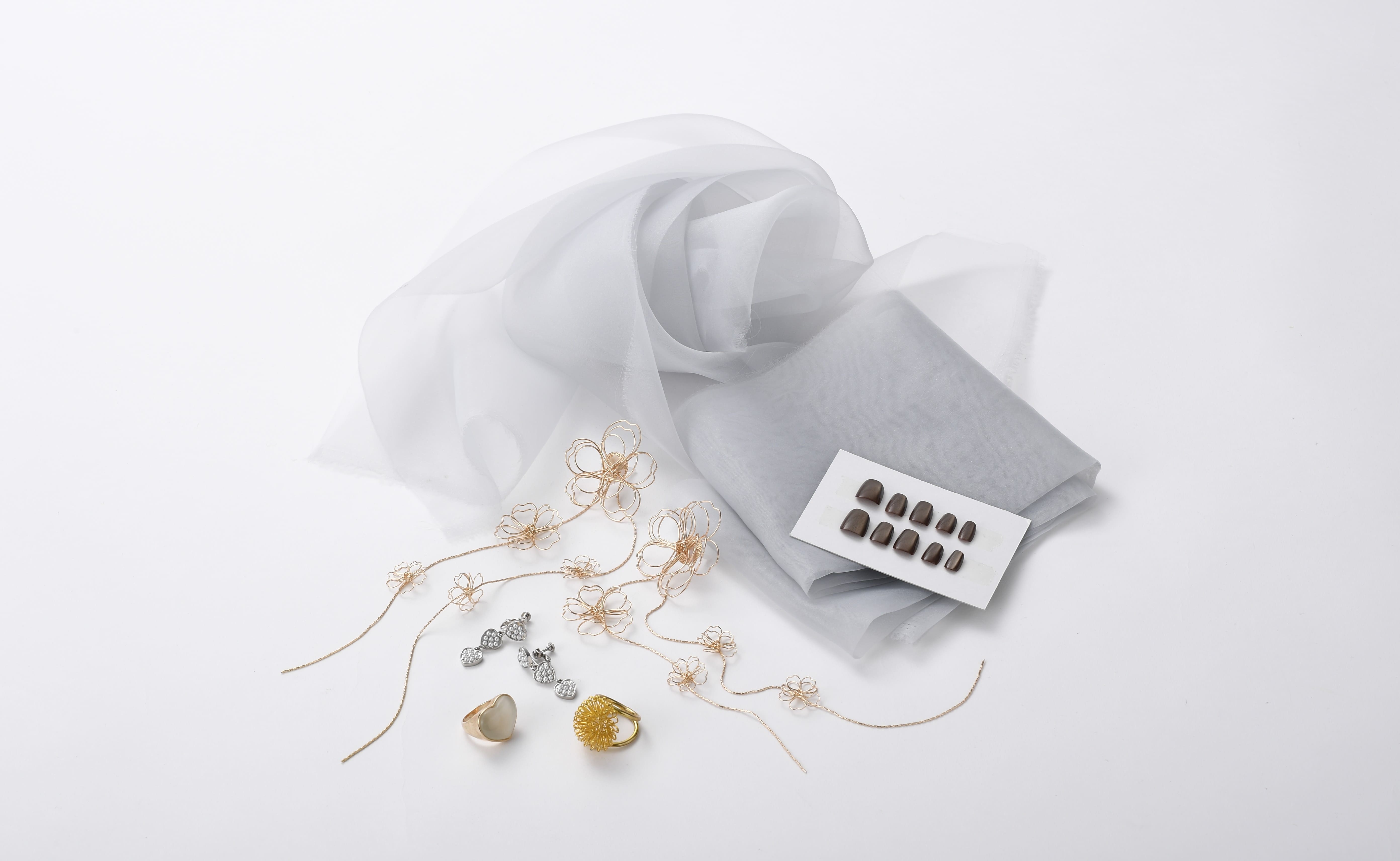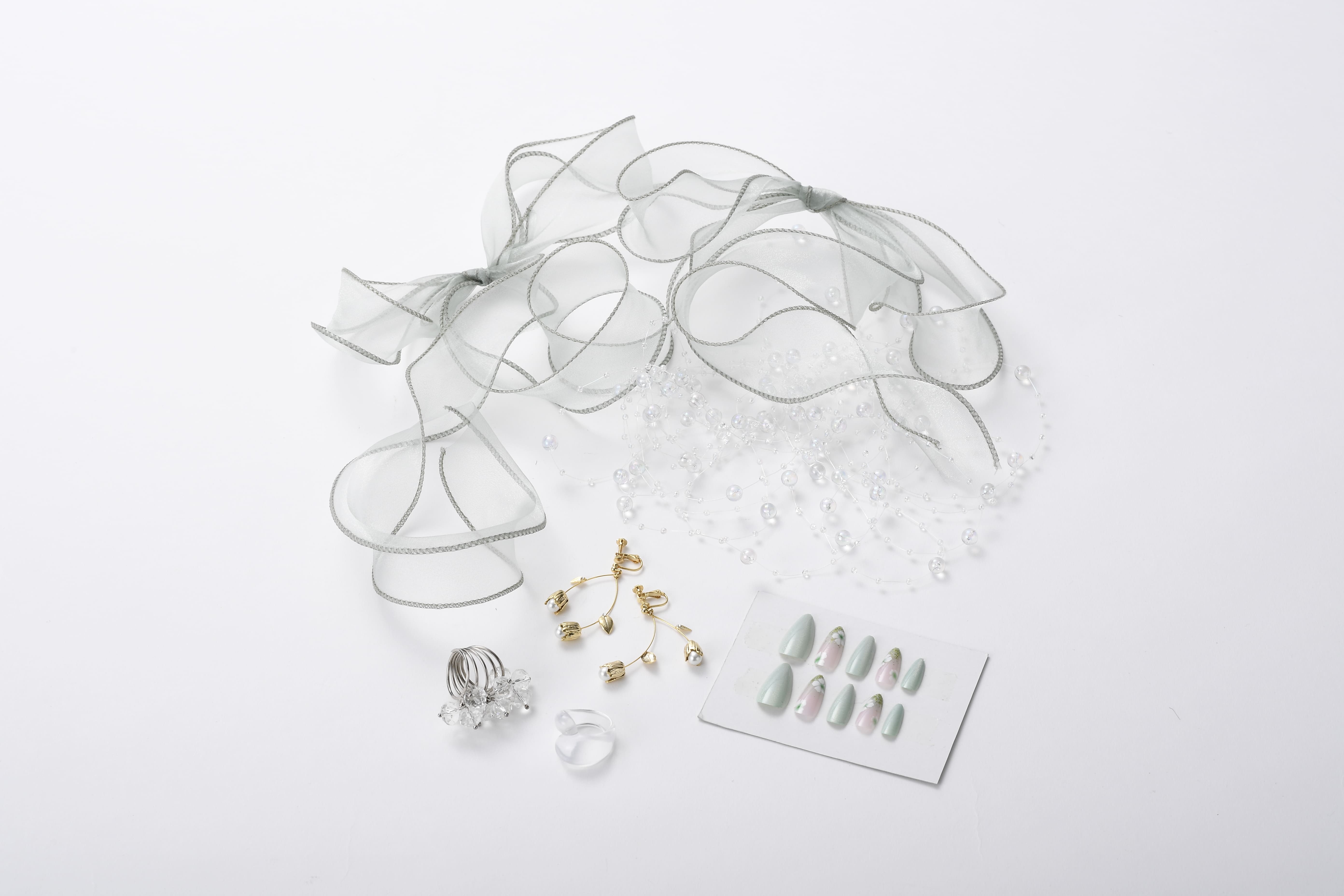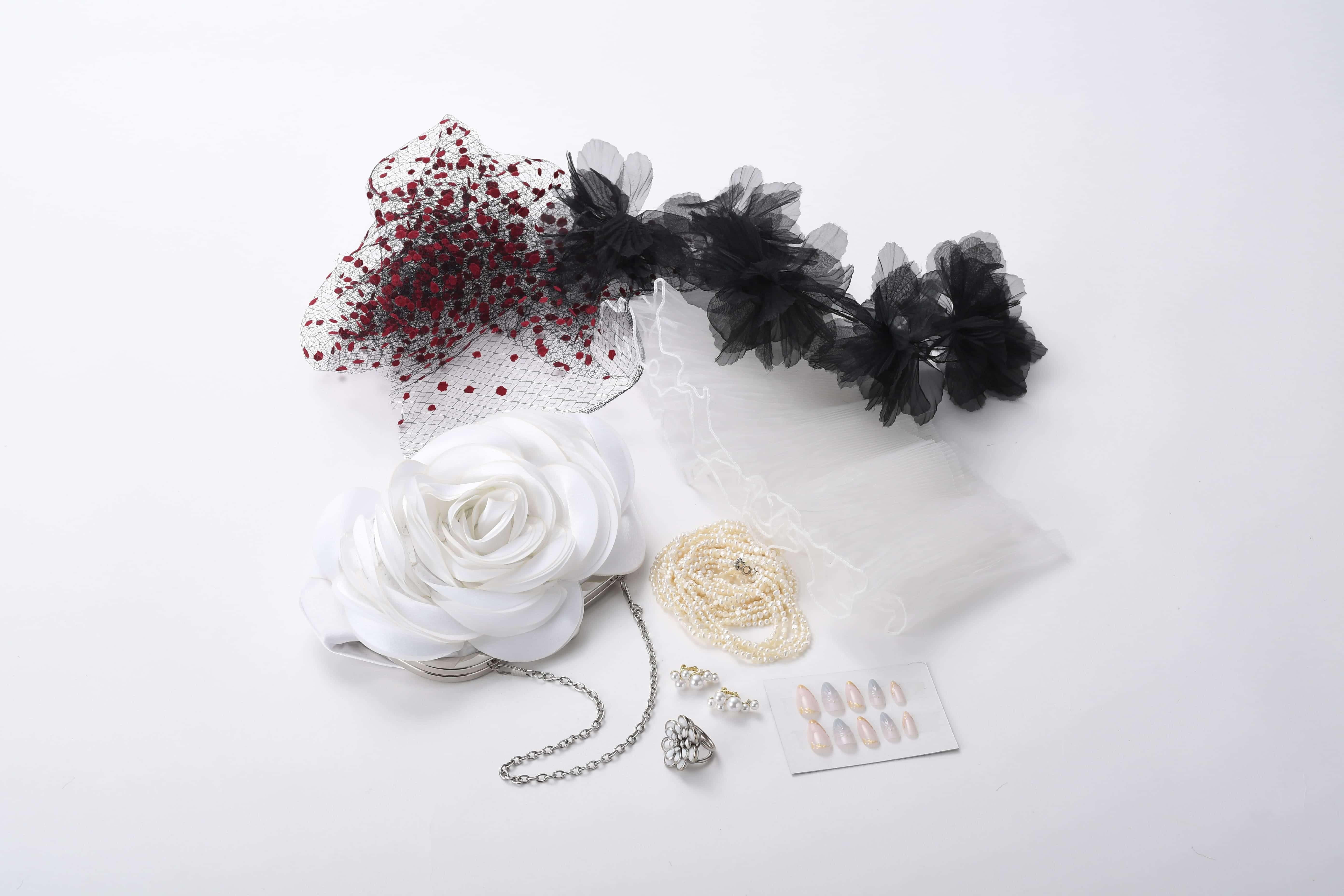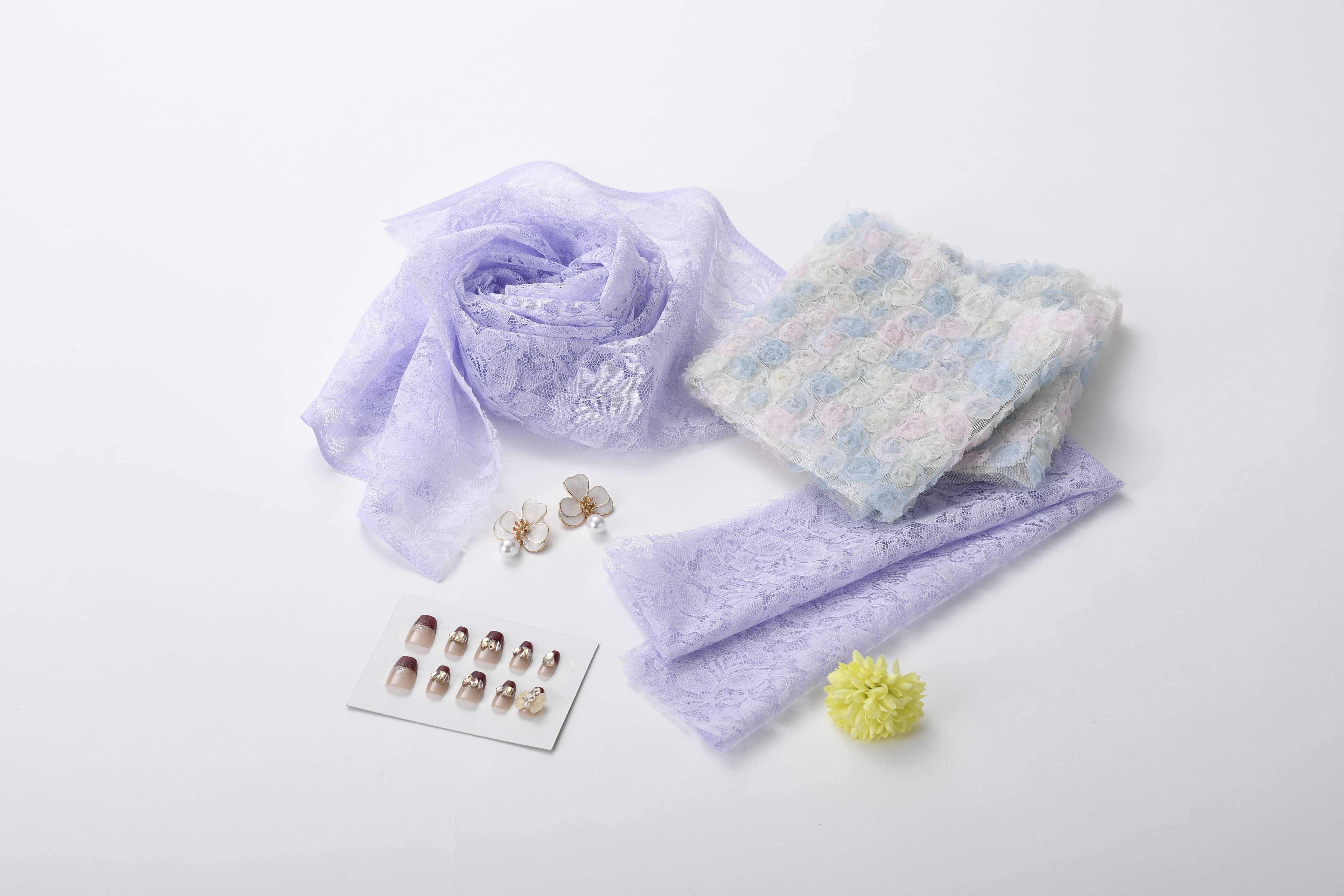 小物でもフラワーモチーフを繰り返すことで、トレンド感のある華やかさを演出できます。レースやチュールにはフラワーモチーフがデザインされていることも少なくありません。