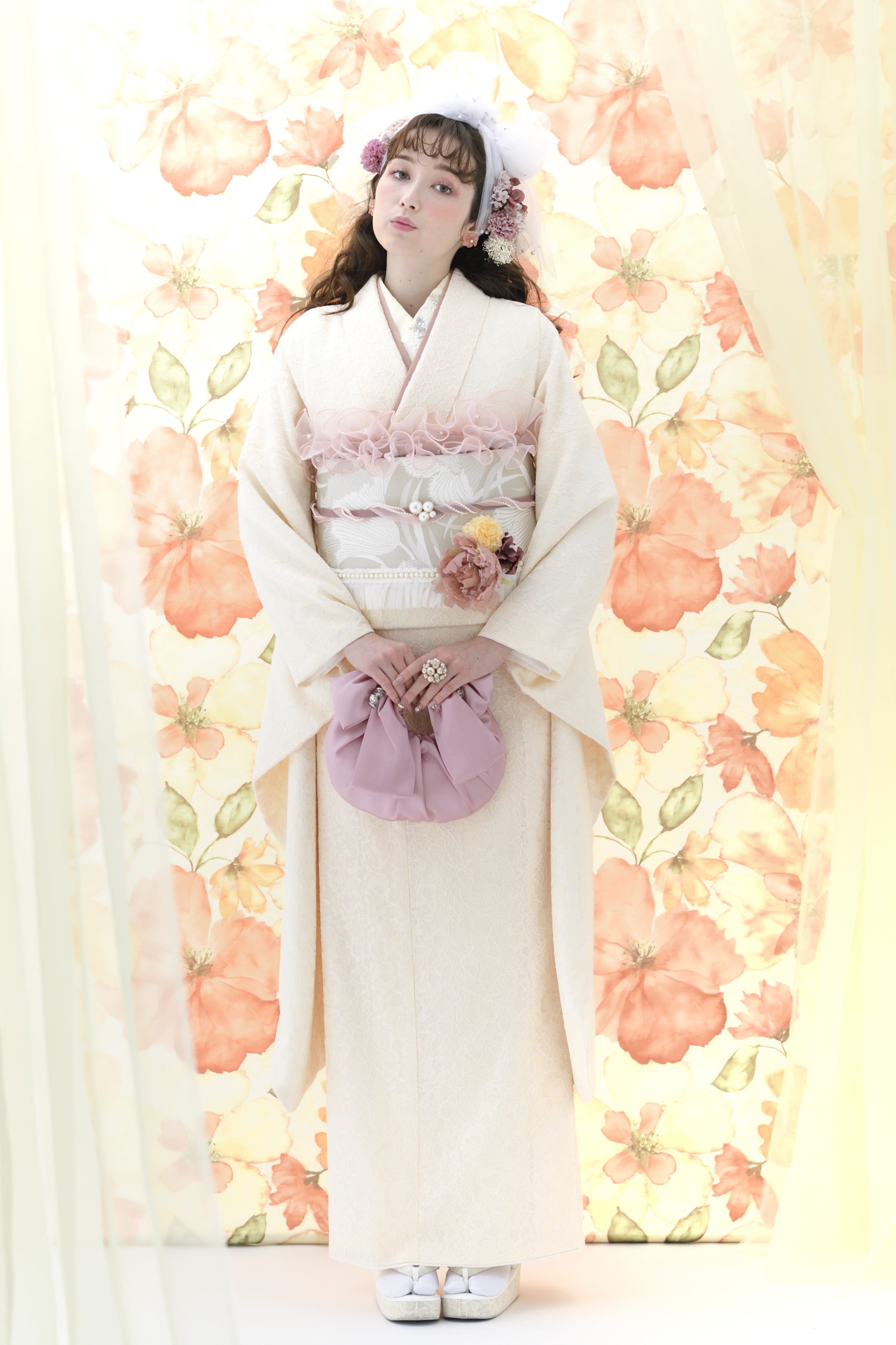 淡いクリームのベースカラーに、フラワーモチーフを折り込んだ美しいレース地でしつらえた振袖は、余計なものを徹底的に取り払った引き算スタイル。光沢のある博多織の帯も、悪目立ちせず今っぽい盛り方に◎。