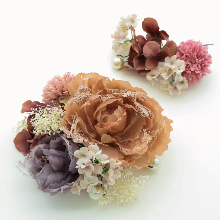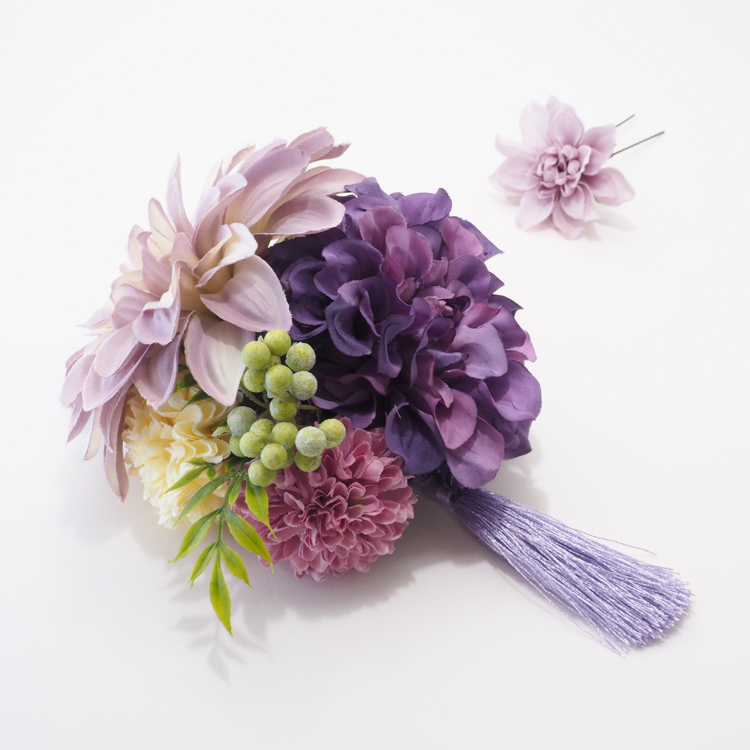 振袖とのバランスや色合わせを意識しつつも、髪飾りには大きめの花飾りをチョイスしてみましょう。生花を使うとフェアリー感がアップします。