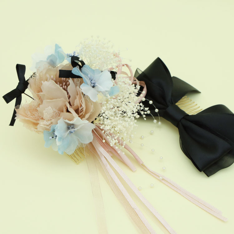 小物使いもフラワーフェアリーの重要な要素のひとつ。振袖は帯、帯揚げ、帯締め、半襟などさまざまな着付け小物をうまくコーディネートしながら雰囲気をまとめていきます。そして、髪飾りももちろん重要なアイテムです。