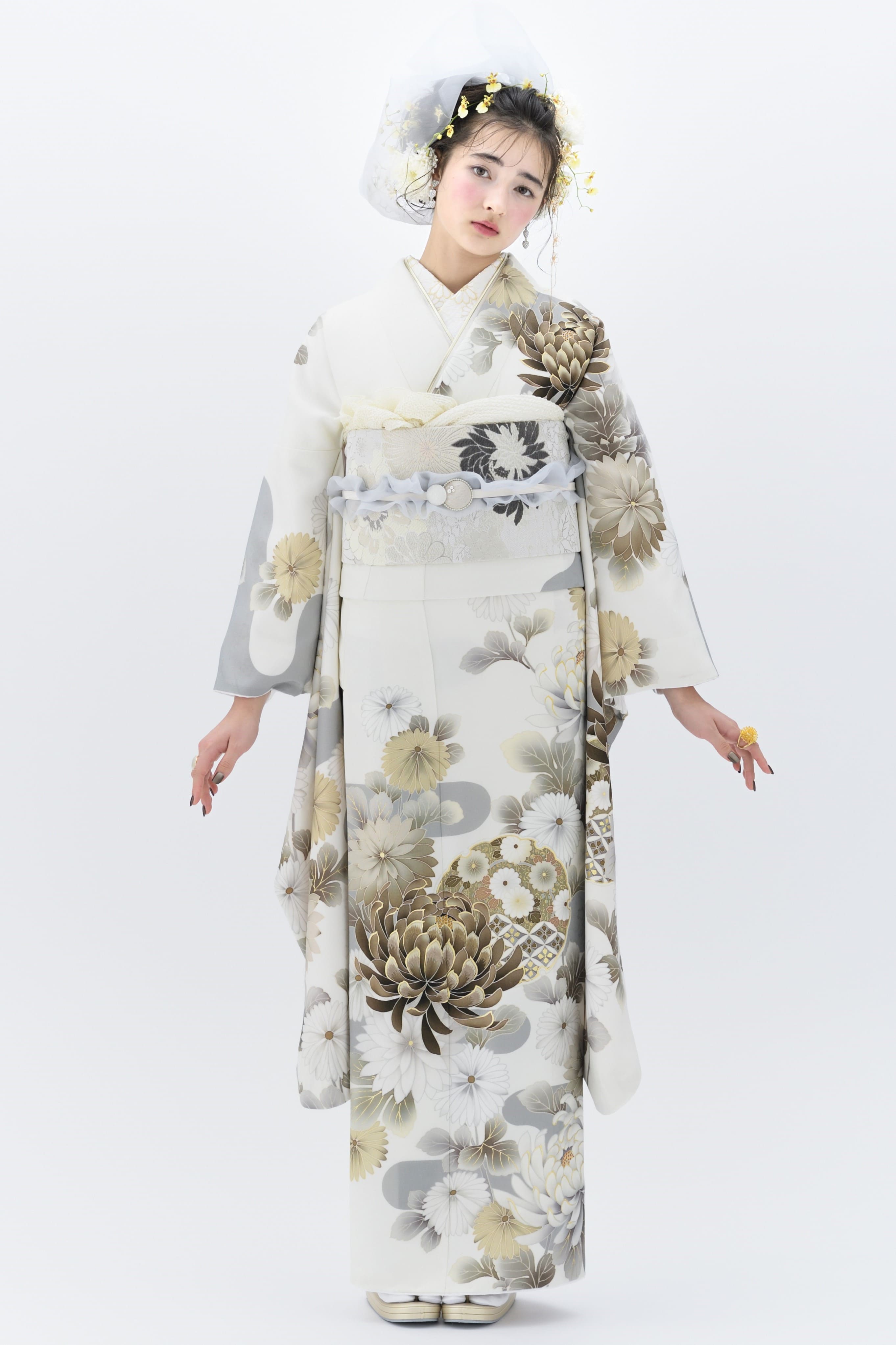 小物使いも、薄いグレーやベージュなど、振袖と同じトーンを意識しています。大振りの花飾りはつつましい白。ベールと生花でやわらかな風を感じさせるコーディネートです。