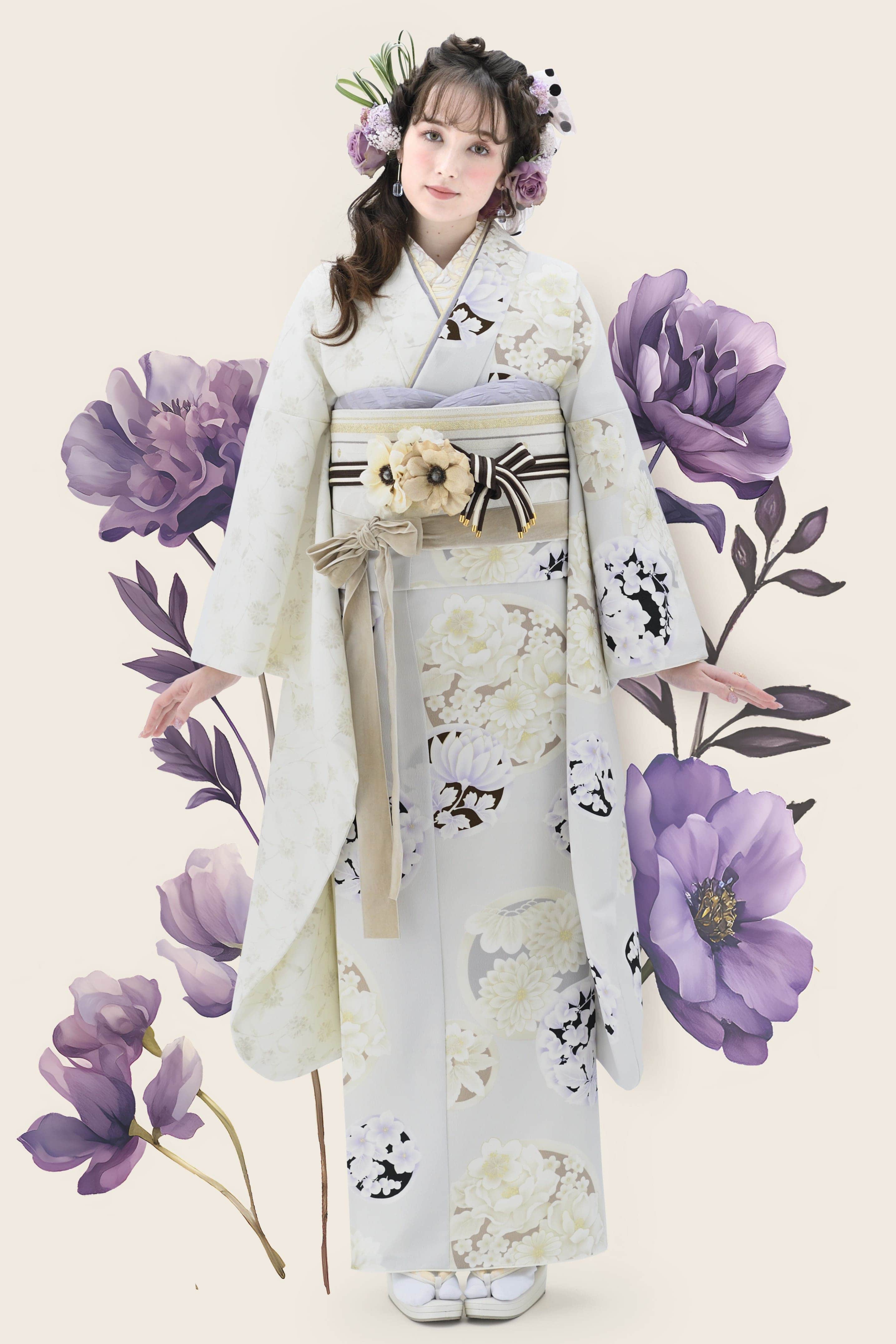 トレンドの白系ベースに、大胆な配色と動きのあるデザインが特徴的な振袖。くっきりとしたイエローとパープルの花々は、今まさに花開いたかのような躍動感があります。