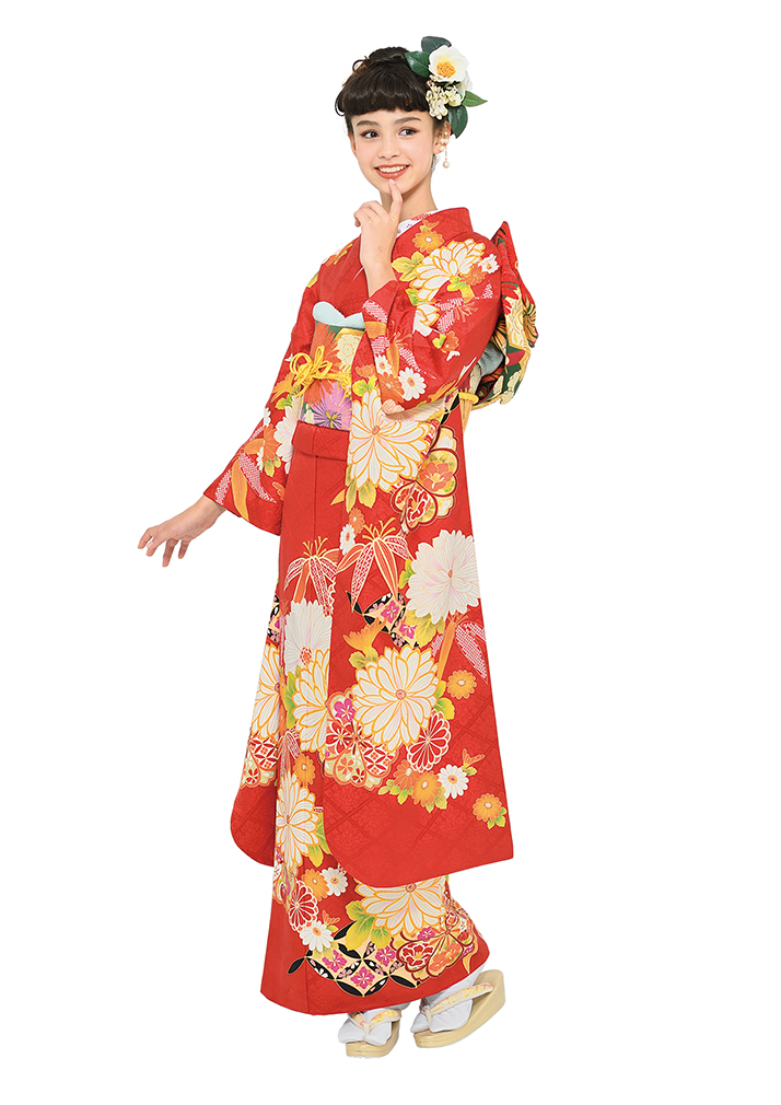 メインの柄に使用している扇の柄は末広といわれており子孫繁栄の願いを込めて着物の文様に使われてきました。国花である菊と桜を合わせ華やかさを演出ました。