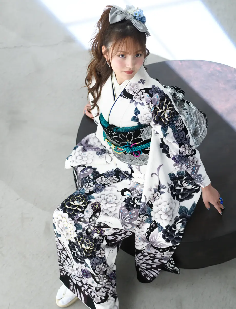 白と黒のバランスが絶妙なモノトーンの地色に花々とたくさんの蝶が舞う姿をデザインした華やかな振袖。蝶には健やかな成長と華々しい開花の願いを込めて。かわいさの中に艶やかな大人っぽさを。