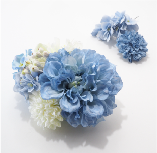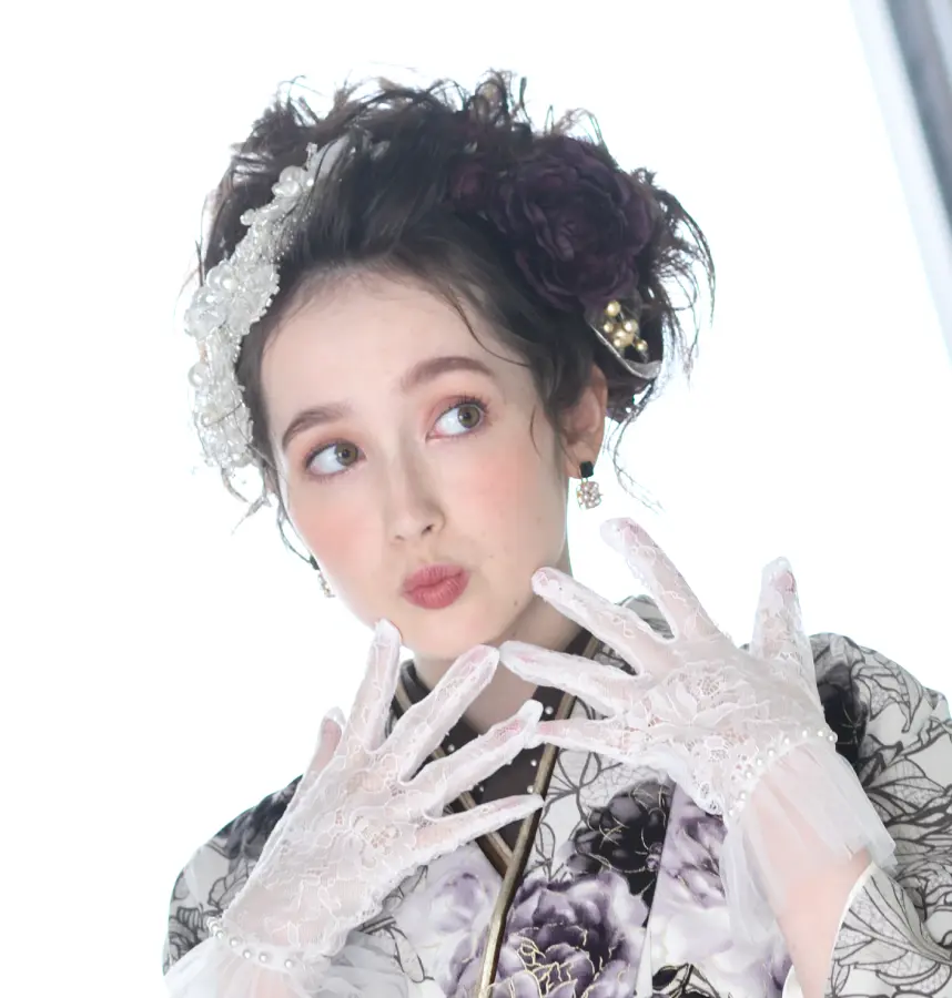 ヘアスタイルは牡丹の花のようにトップにボリュームをだして、丸みを帯びたアップスタイルに。顔周りの後れ毛をだして、媚びない大人の色っぽさを。