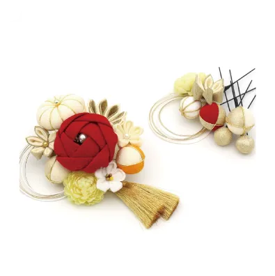 前髪はぱっつんに整え、毛先を少しカールさせてガーリーな仕上がりに。サイドの髪は姫カットにすると和の雰囲気がアップ。花髪飾りは大きめのものチョイスし、帽子のように斜めに飾ると背高効果に。