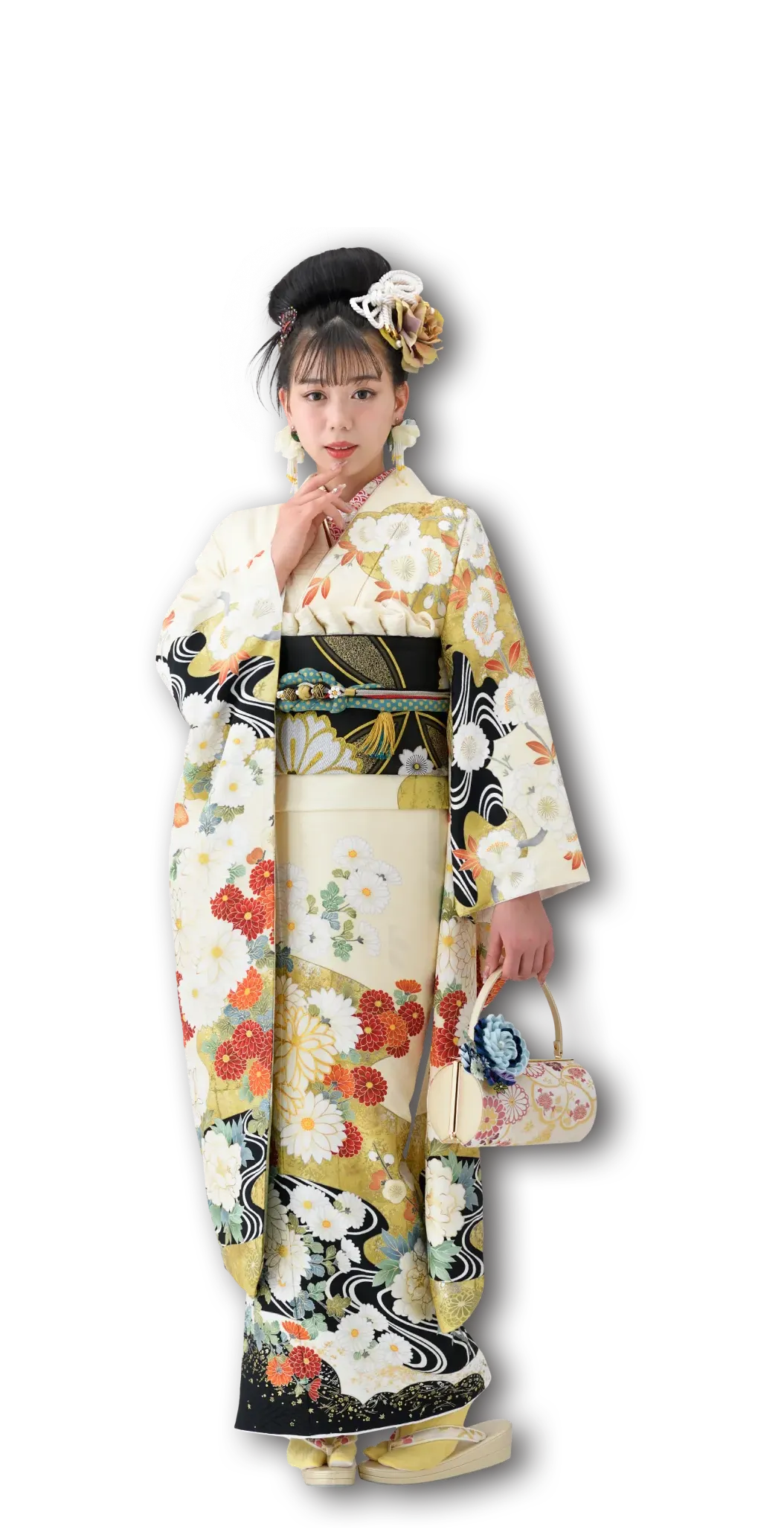 "琳派(りんぱ)"という煌びやかな様式を基にした1着。まるで屏⾵に描かれた絵のように洗練された美しさ!裾から肩に流れる流⽔は、縁起が良く上品な古典柄。菊の花や菖蒲(あやめ)の花が、大人の落ち着きを演出してくれます。