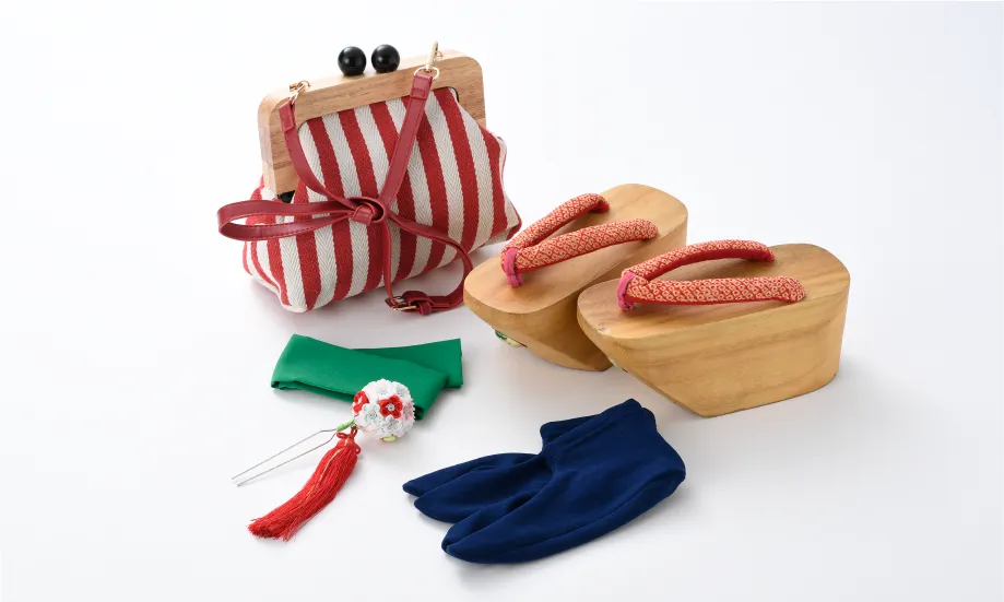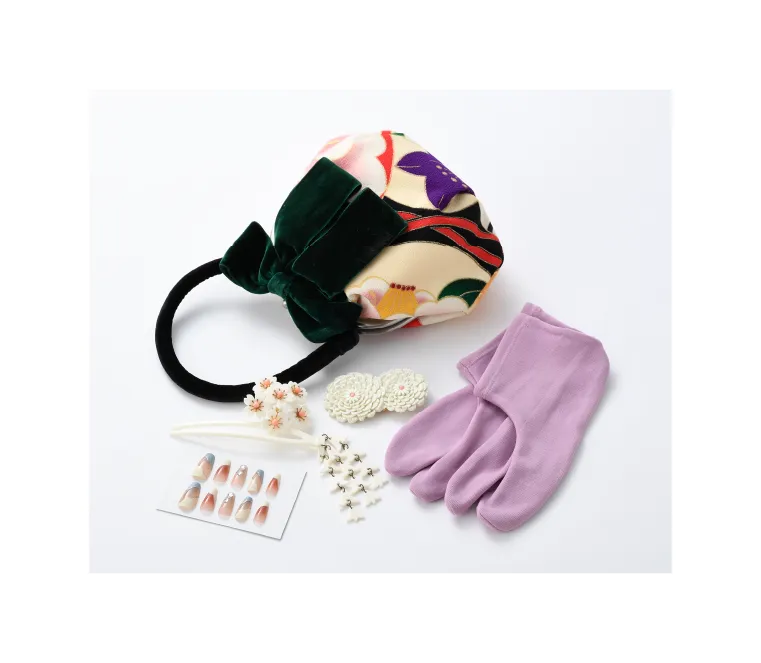 「上着」「スカート」「おはしょり」の3つのパーツに分かれている振袖。どなたでも着用できるユニバーサルデザインで、たとえば車椅子の方でもハレの日スタイルを楽しんでいただけます。