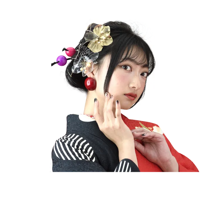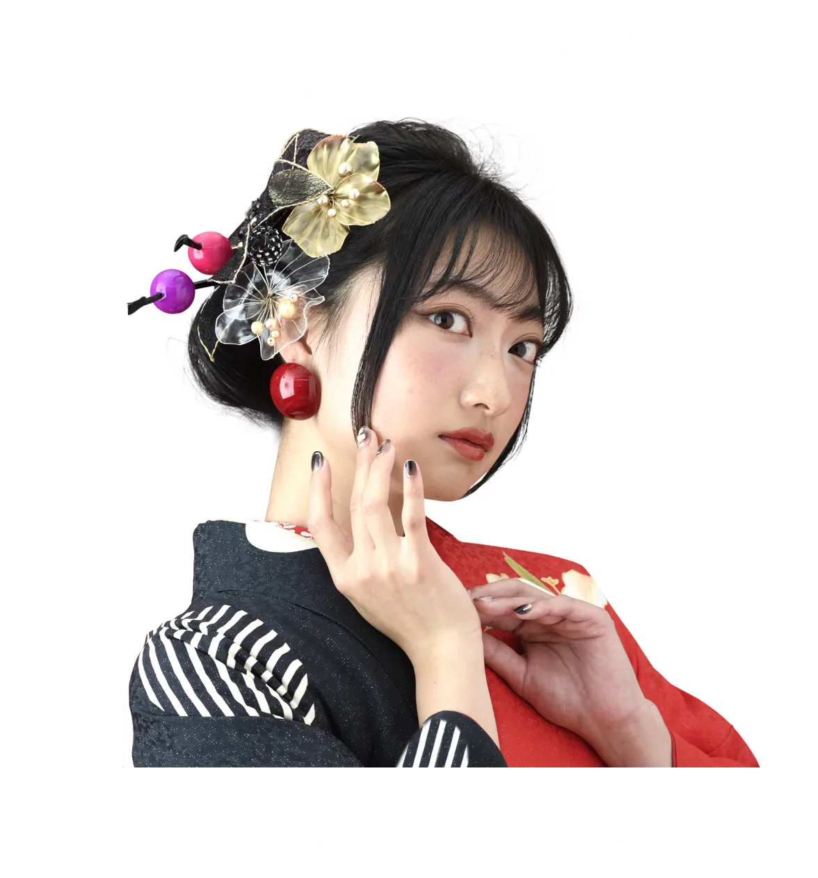 高めの位置でロングのポニーテールをつくり、サイド・えりあしはキュッと引き上げボリュームが出ないように。濃い目の赤リップで強調し、キリっと感を出すと、凛とした着物にマッチします。