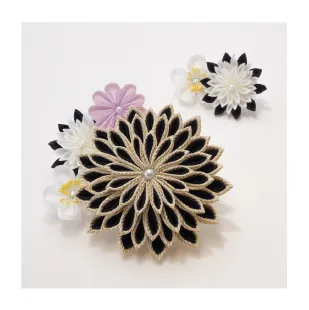 大胆に描かれた牡丹の花と、菊・竹・桜が織りなす洗練されたデザイン。さらに、疋田(ひった)文様を入れる事で、花々に立体感が生まれています。金彩加工と横降り刺繍で仕上げてモダンな印象に。