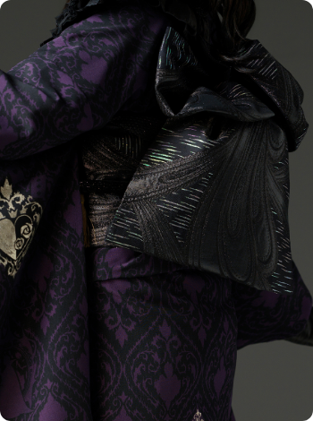 ディズニーヴィランズ達を象徴するアートを文様に見立て統一感がでるよう同色で着姿になったときシンプル且つポイントになるよう配置しました。