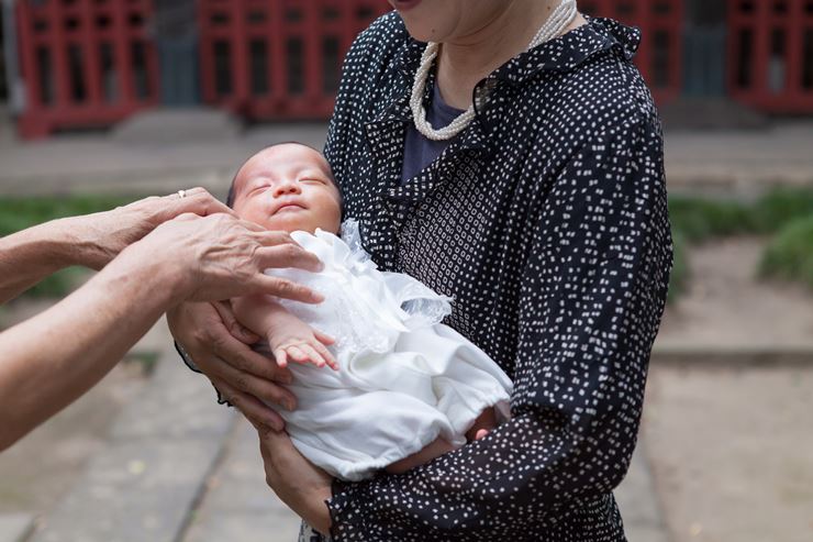 お宮参りでは、祝着(のしめ)に身を包んだ赤ちゃんを抱っこしてご祈祷に行きます。赤ちゃんを抱っこするのは、古くから父方の祖母の役割です。